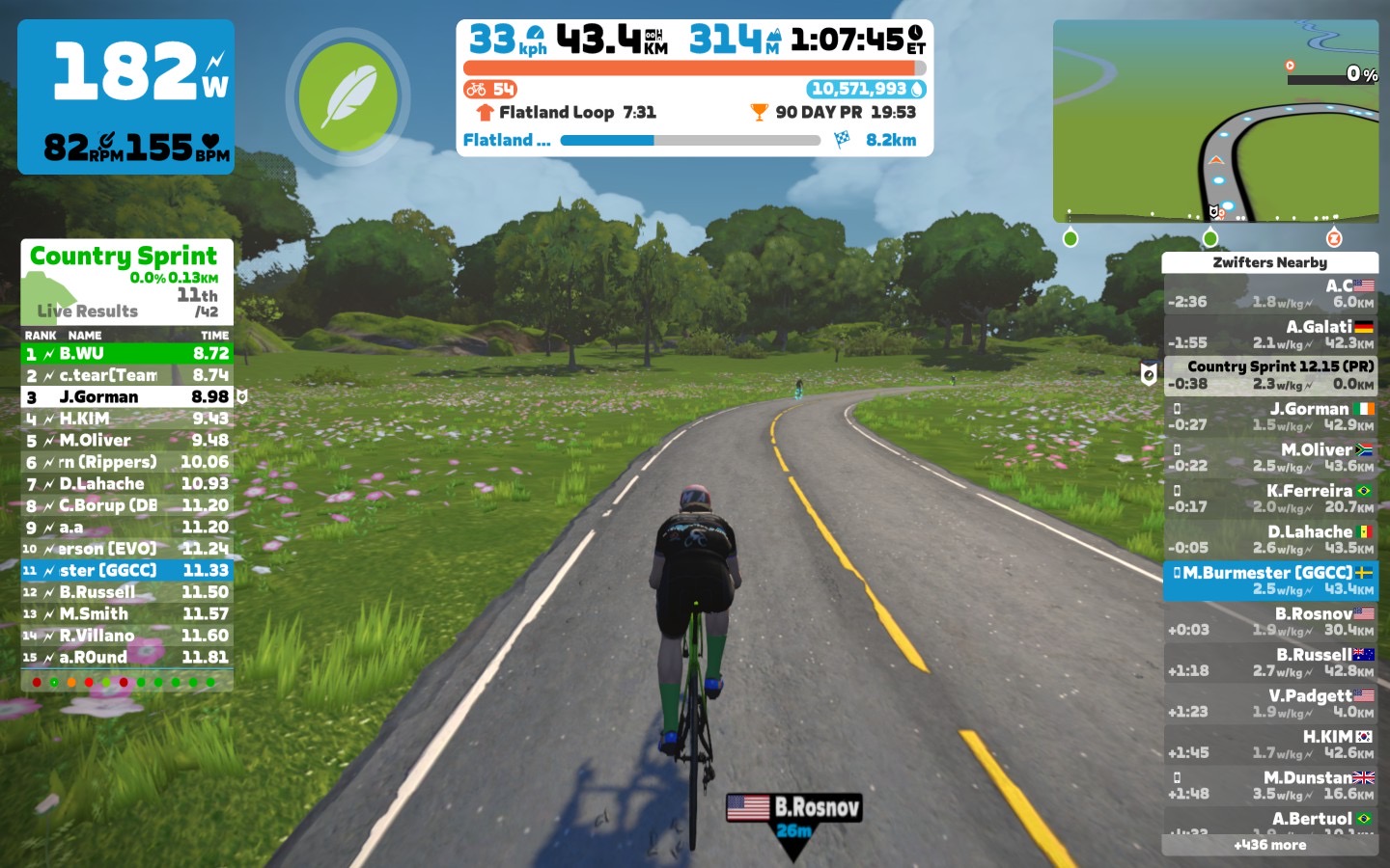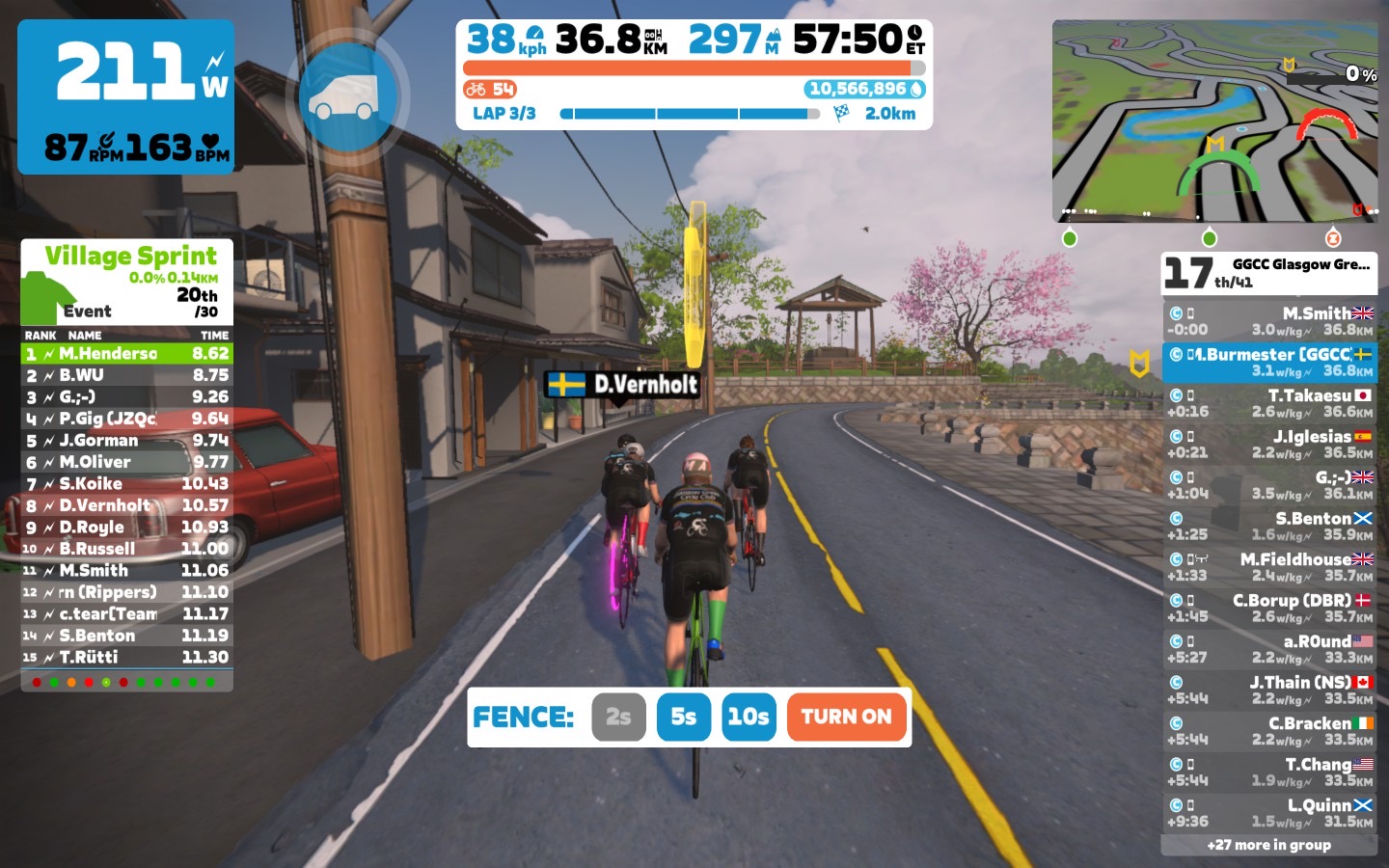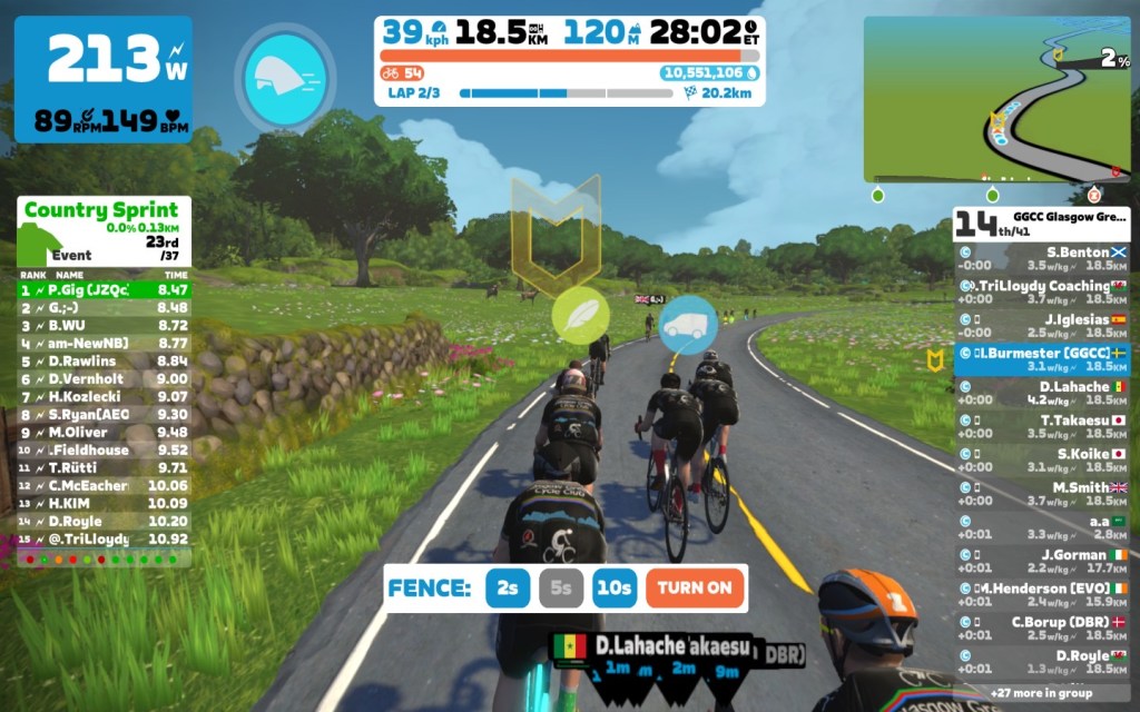We started at a good warm-up pace to get some blood into the legs. Every lap had two sprints, the Country Sprint and the Village Sprint. On the last lap we just did the Country Sprint because of the optional mini-race.