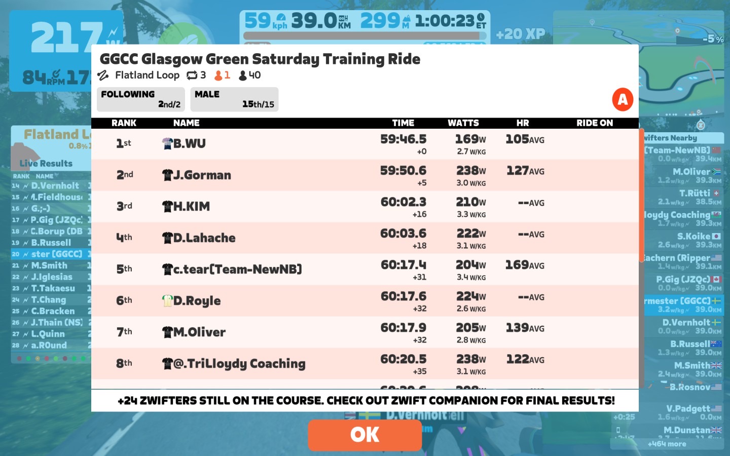 Today I was leading our GGCC team through the virtual streets of the Flatland Loop on the Zwift riding platform. In total it was a three lap training ride with some good sprints and an optional mini-race.