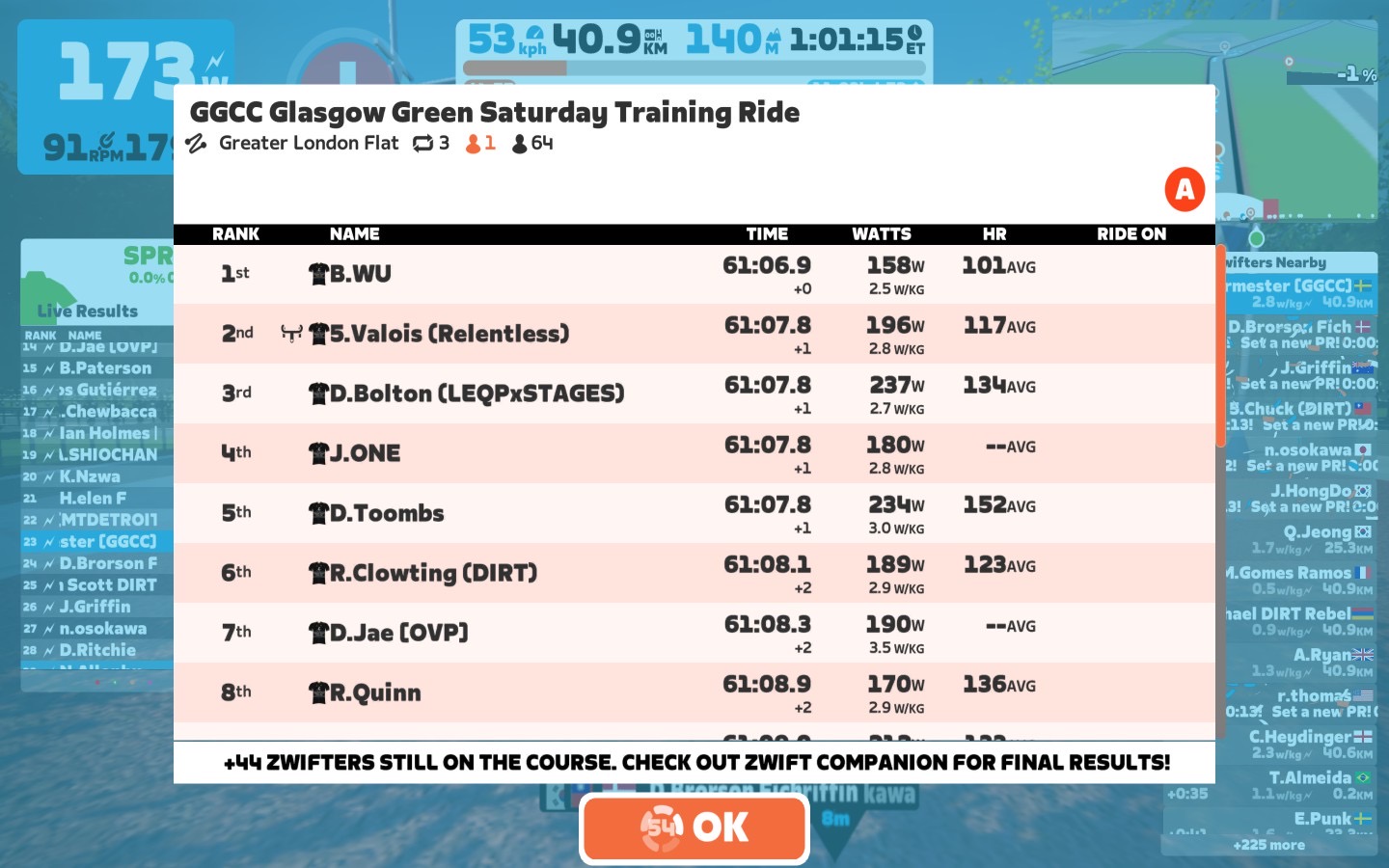 Today I was leading our GGCC team through the virtual streets of London on the Zwift riding platform. In total it was a three lap training ride with some sprints and good chatting. Roger was our sweeper for today, thanks mate.