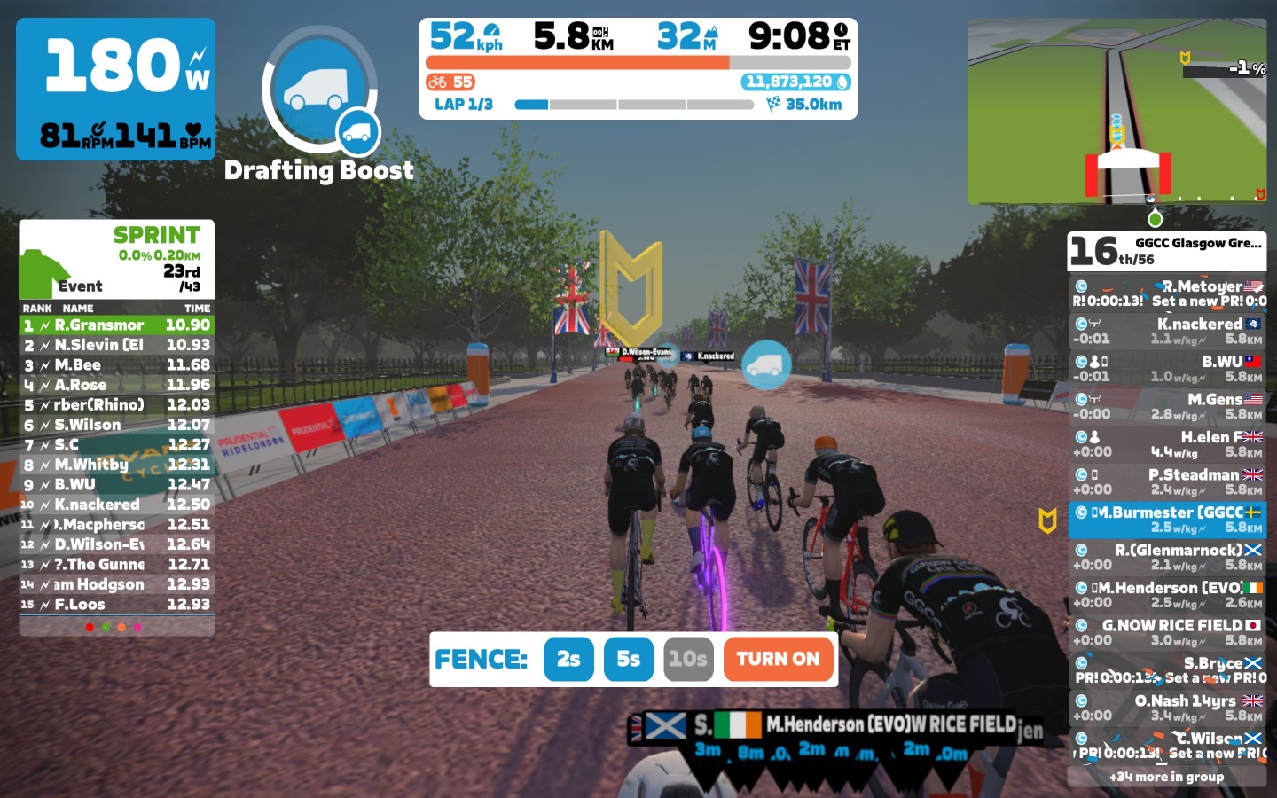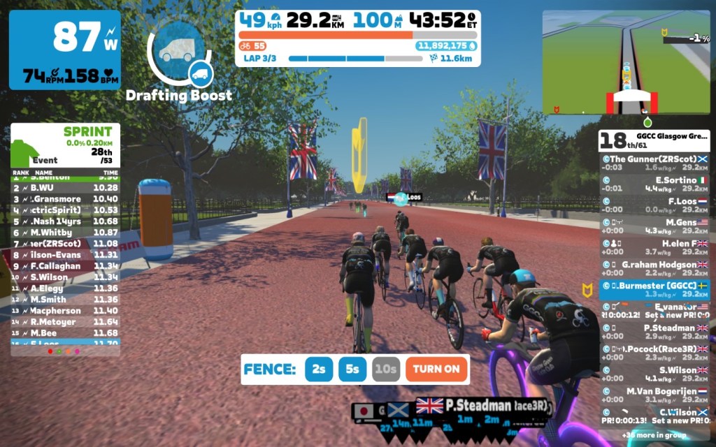 Today I was leading our GGCC team through the virtual streets of London on the Zwift riding platform. In total it was a three lap training ride with some sprints and good chatting. Brian was our sweeper for today, thanks mate.