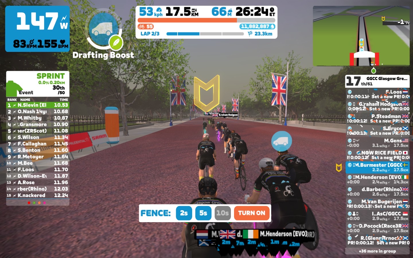 For the lead in lap we did around 2,6 W/kg until the first sprint. After the sprint was done we pushed more around 2,8 W/kg for the whole lap, around 3,2 W/kg on the bumpers. During the mini-race I stayed at pace around 3,2-3,4 W/kg.