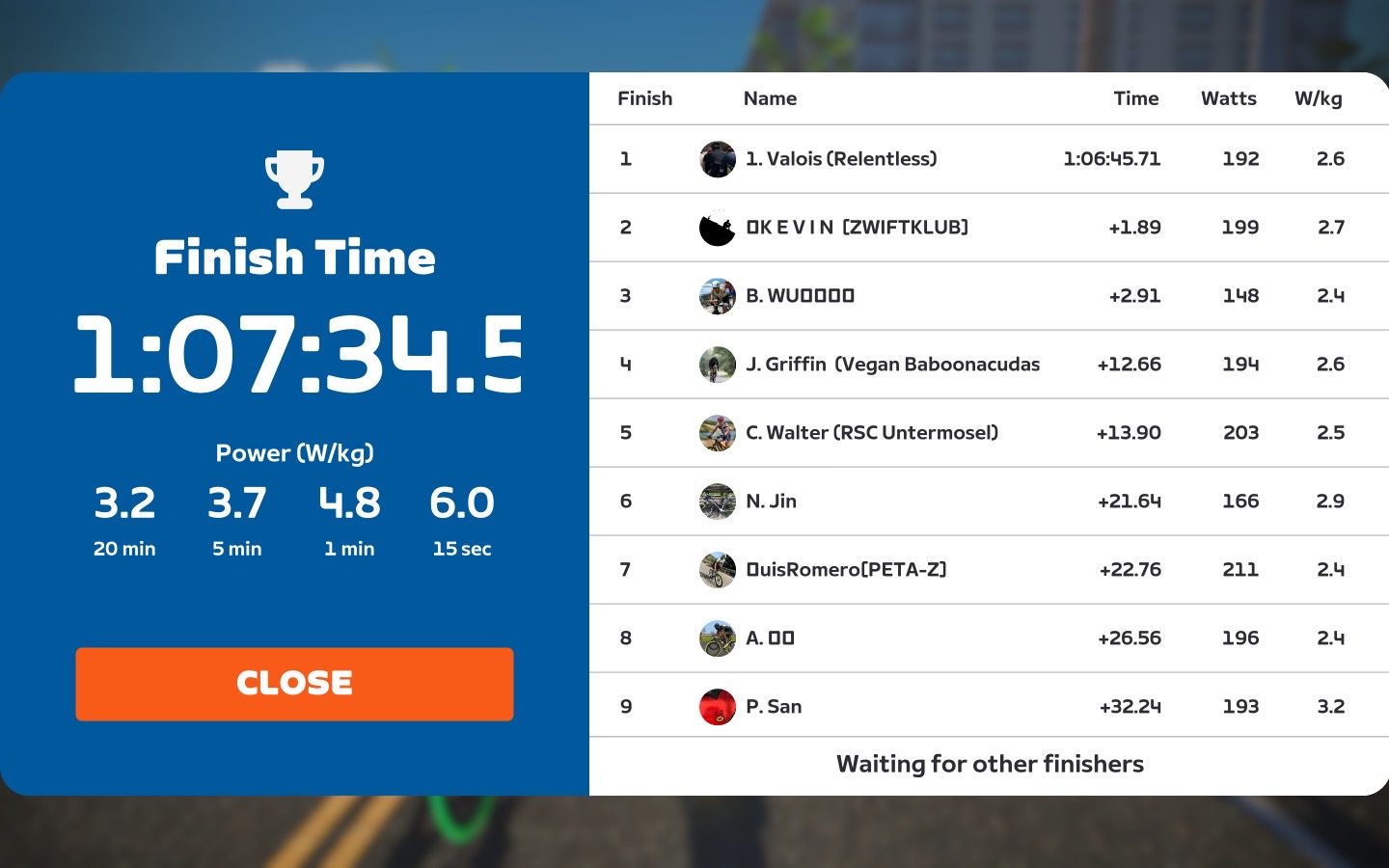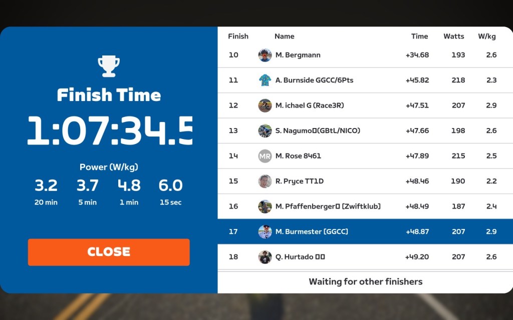 Today I was leading our 6Points Mallorca team through the virtual streets of Watopia on the Flat Route of the Zwift riding platform. In total it was a 4 lap training ride with some sprints and an optional mini-race at the end, around 5km.