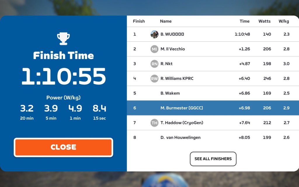 As always we started with a good 2,6W/kg for warming up the body until the first sprint, which came quite early. The first sprint was not taken too hard from our sprinters, some wanted to save their legs i guess. From the lap banner we raised the power around 2,8W/kg, and a little higher on the uphills. The group could stay together, good job guys.