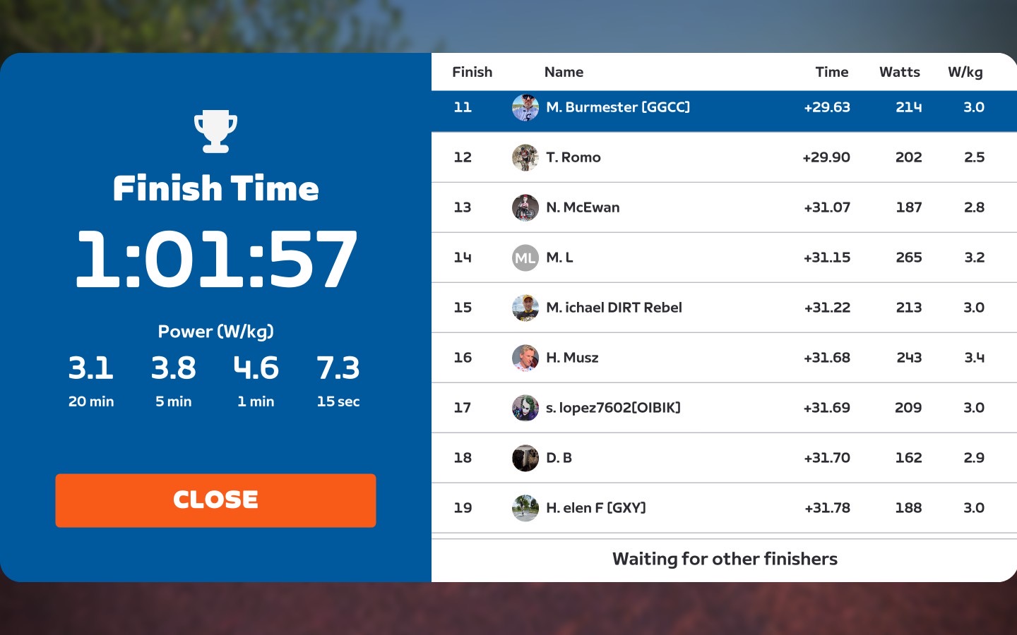 I raised the power at 2,8-3,0 W/kg for the most of the laps. During the ride we went a little harder on the bumpers. There was also quite a good chatting ongoing, both on the Zwift chat and on Discord.