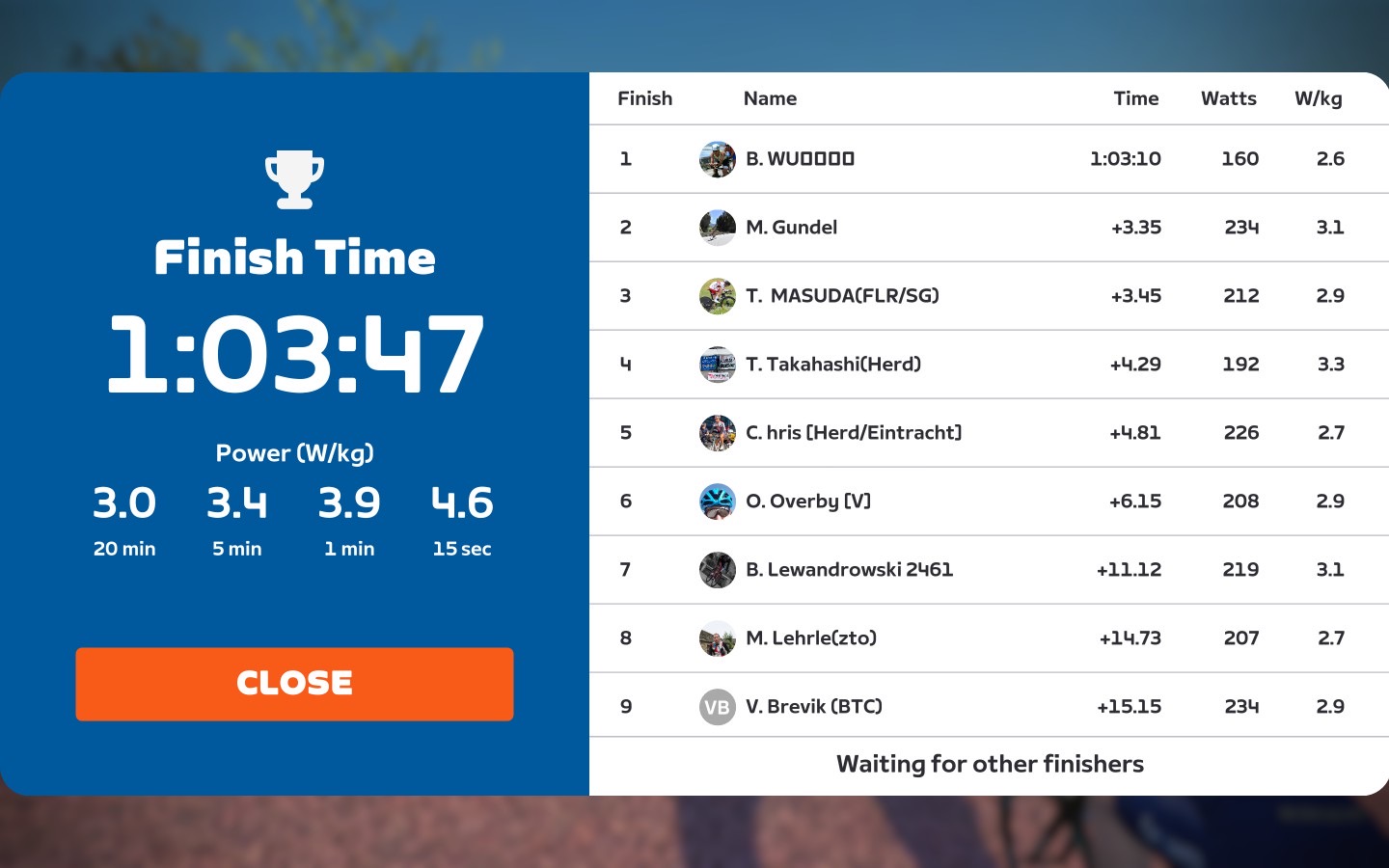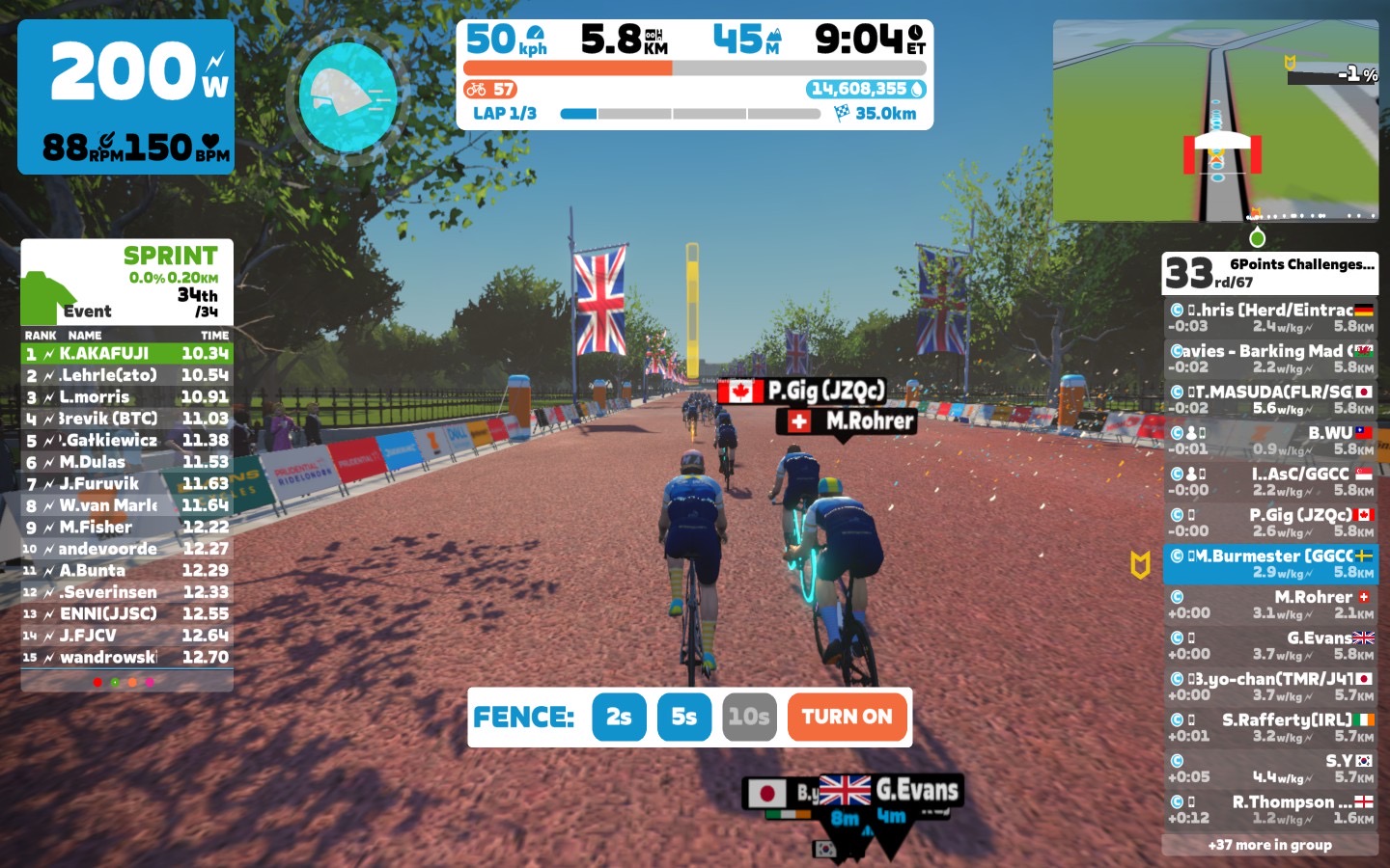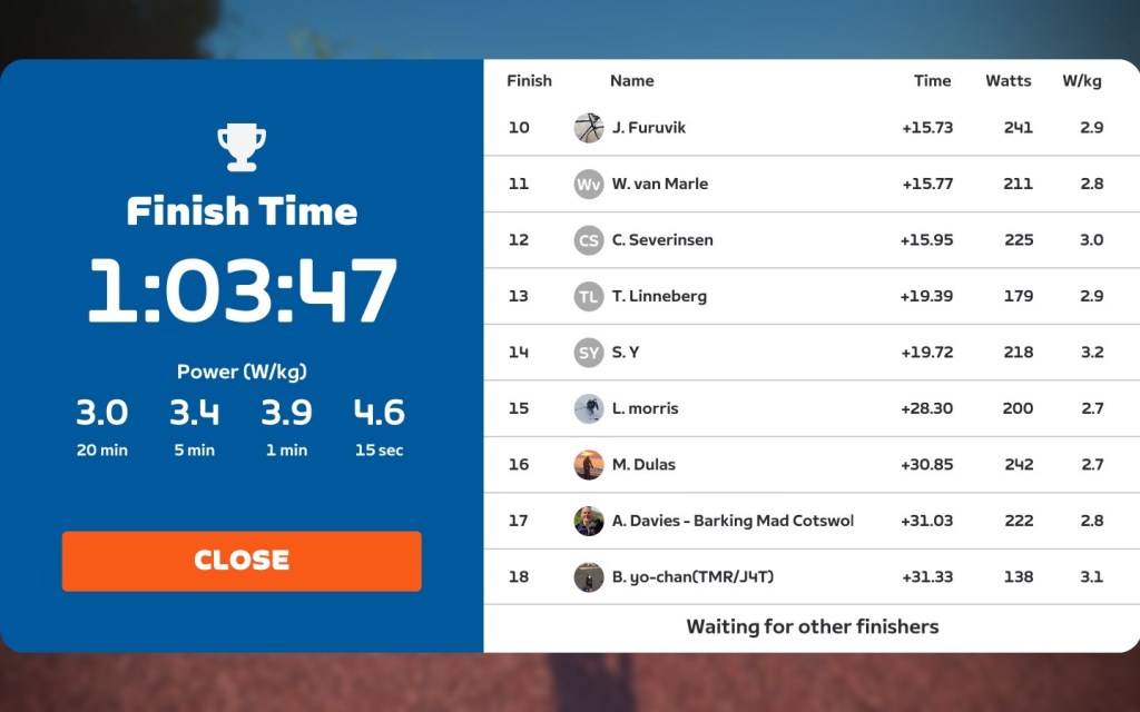 I raised the power at 2,8-3,0 W/kg for the most of the laps, for my 71kg this is a 208W avg. During the ride we went a little harder on the bumpers. There was also quite a good chatting ongoing, both on the Zwift chat and on Discord.