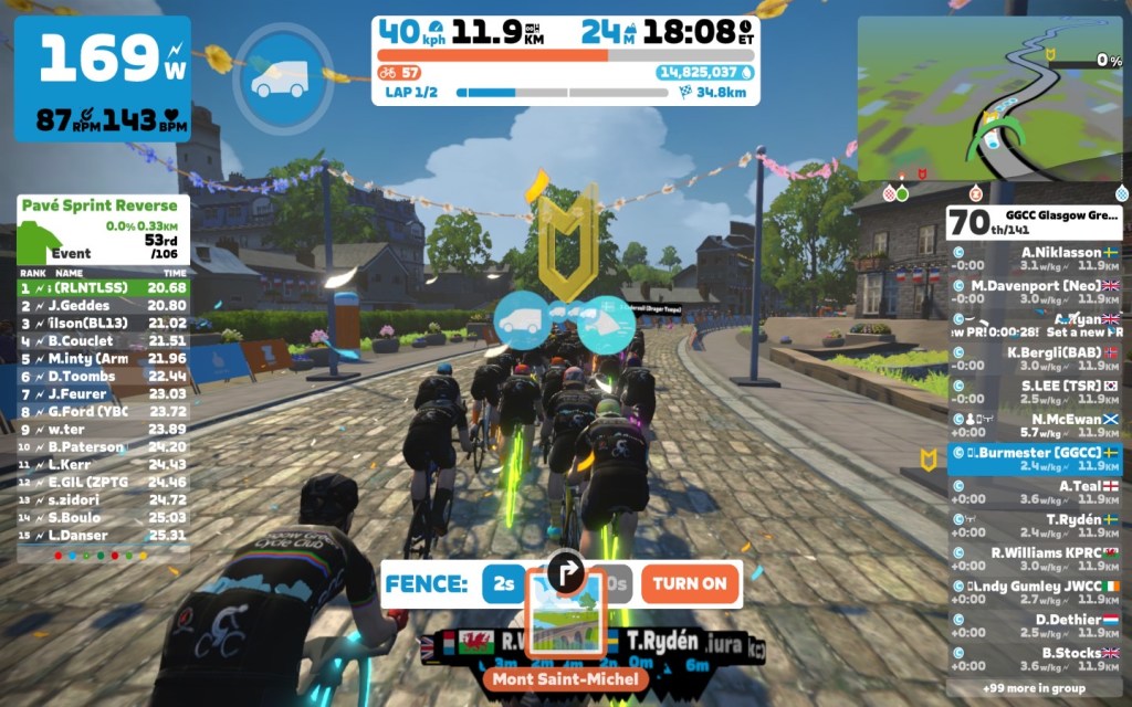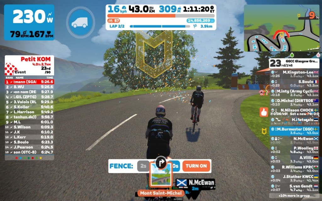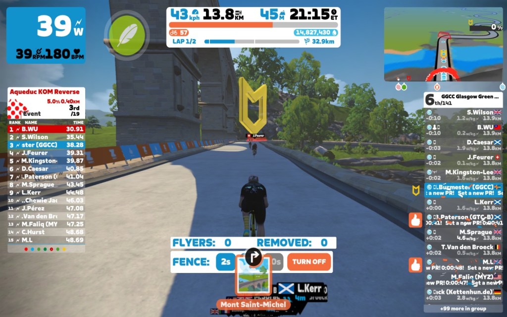 Today I was leading our GGCC team through the virtual streets of France on the “Casse-Pattes” course on the Zwift riding platform. In total it was a two lap training ride with two sprints, two climbs each lap and an optional mini-race at the end of the ride.