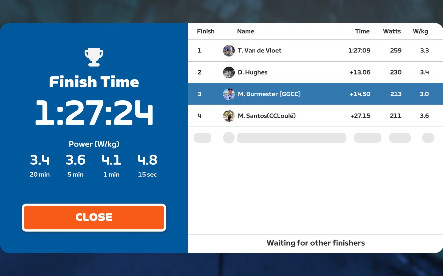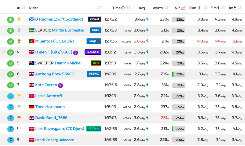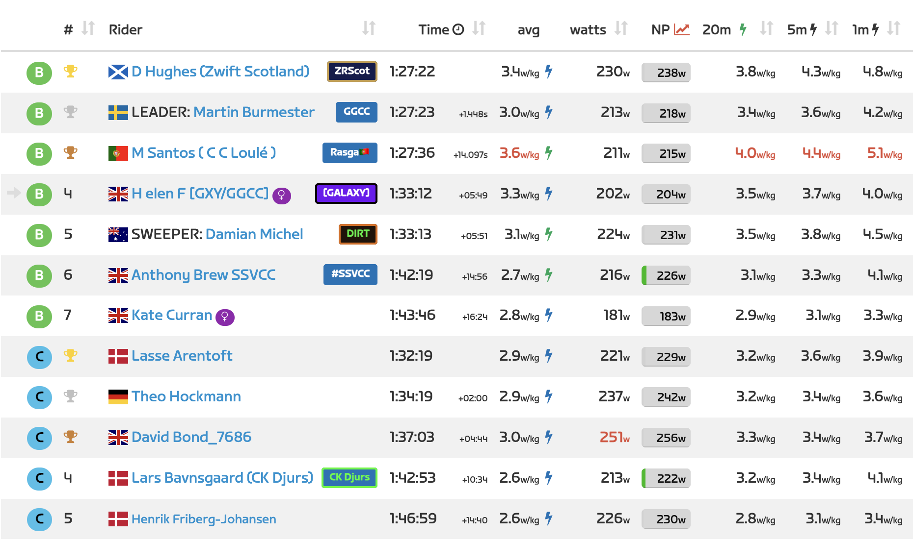 The lead-in part was quite ok and we had a good group together. But after the start banner and during the first climb quite some riders had issues with the average pace of 2,8W/kg.