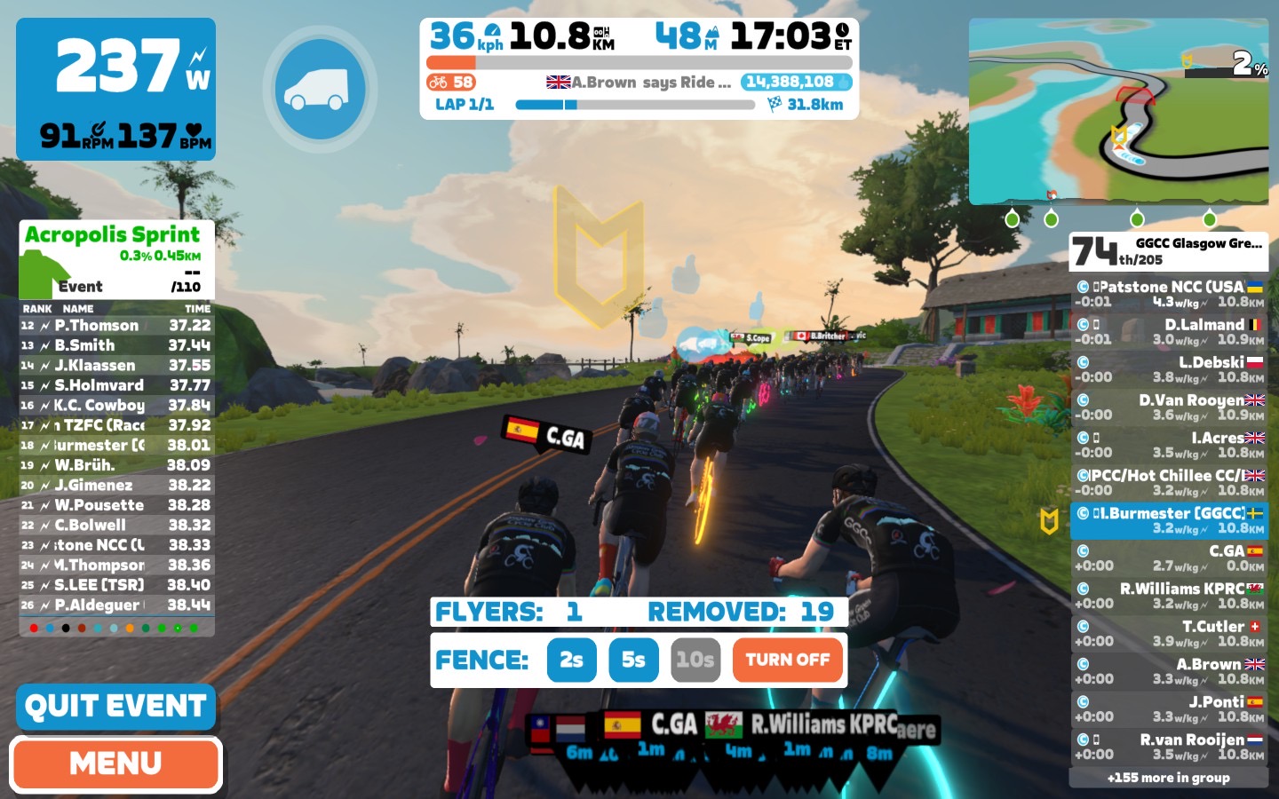 In the peloton we had some riders riding very close to our fence with was 10sec in front of me. Unfortunately, after a sprint and because of the profile they went way too far in front of the fence and were disabled.