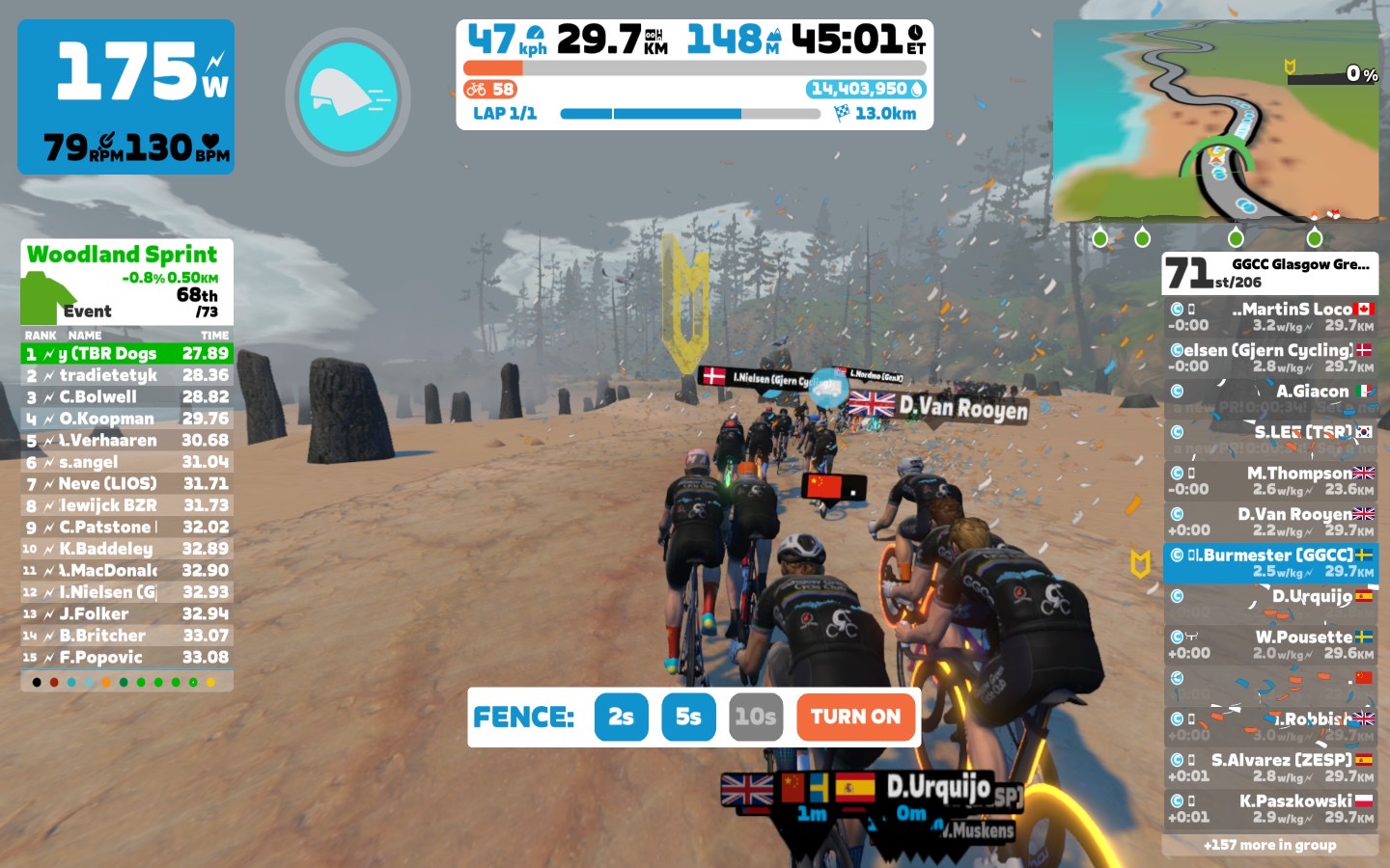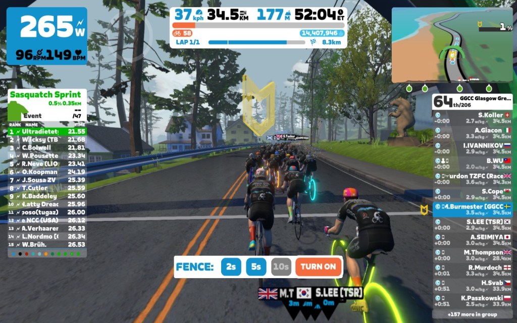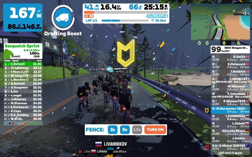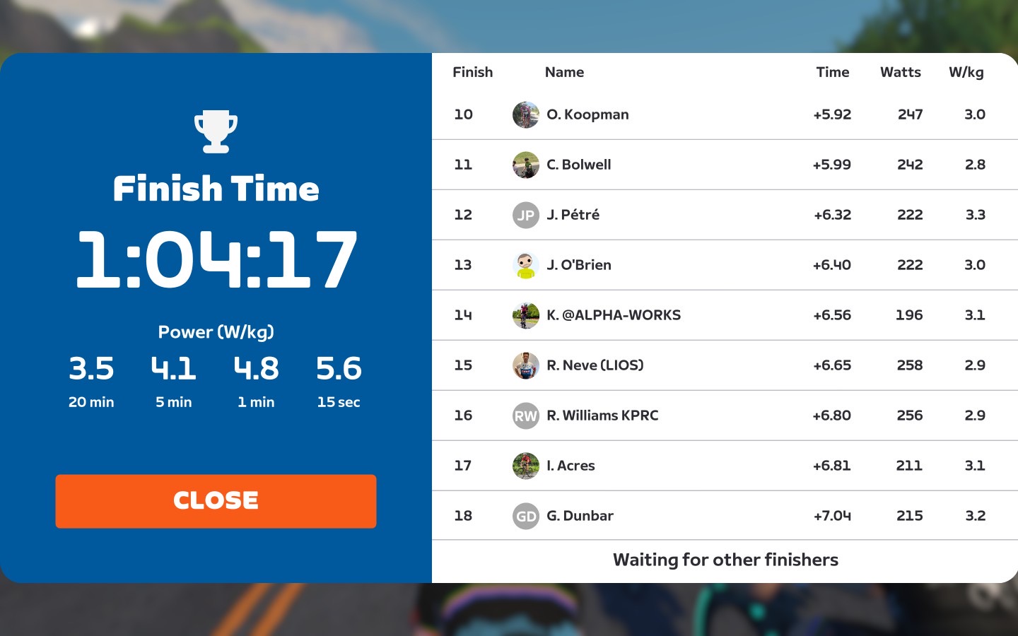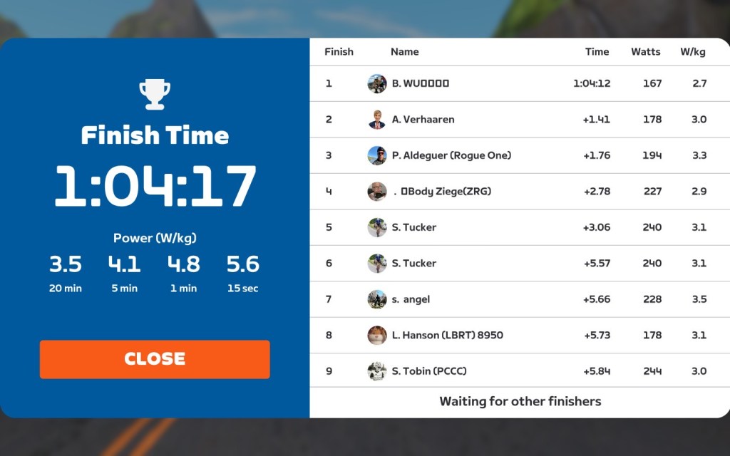 Today I was leading our GGCC team through the virtual streets of Watopia on the new “Coast Crusher” course on the Zwift riding platform. In total it was a hard training ride with an optional mini-race at the end of the ride.