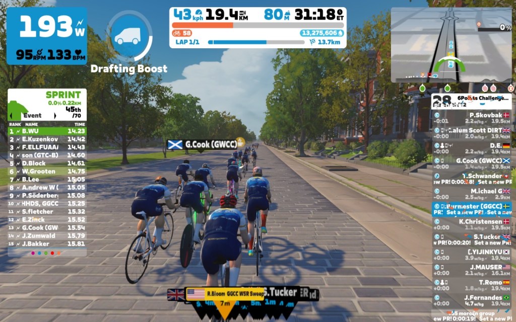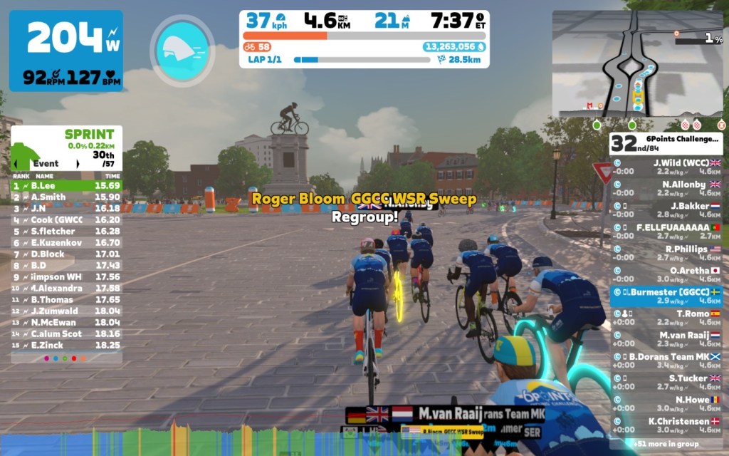 Today Roger B. was leading our 6Points Mallorca team through the virtual streets of Richmond on the “Libby Hill After Party” course on the Zwift riding platform. In total we had four sprints on the flats before going into our optional mini-race at the end of the ride.