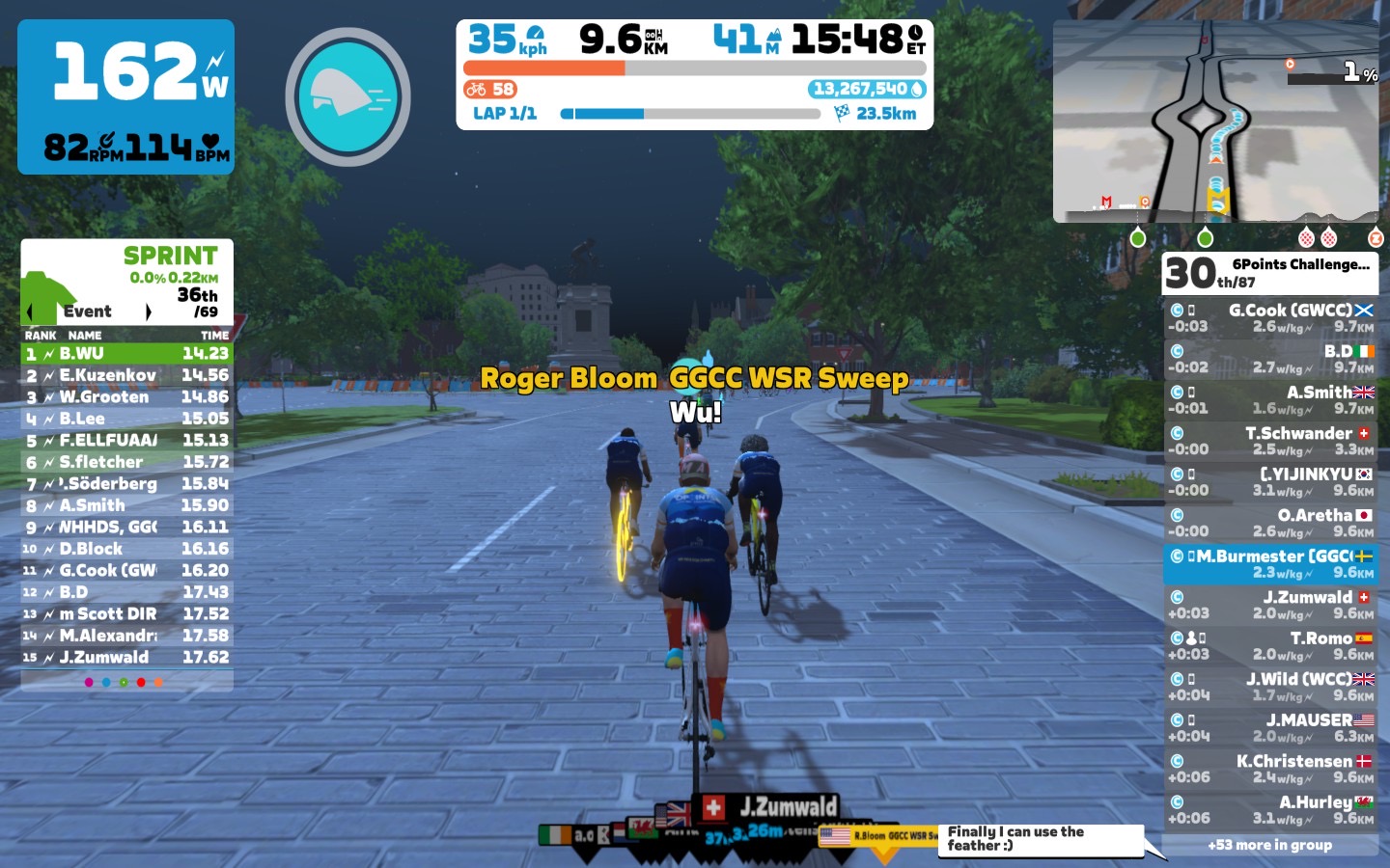 Roger went at a relaxing 2,6 W/kg for the flat part of the course. Every lap on that we could sprint to raise the HR a bit more. Our good friend B. Wu could really show what he had in his legs, but there were also some other rider with strong legs. In total the sprinters could show their legs four times.