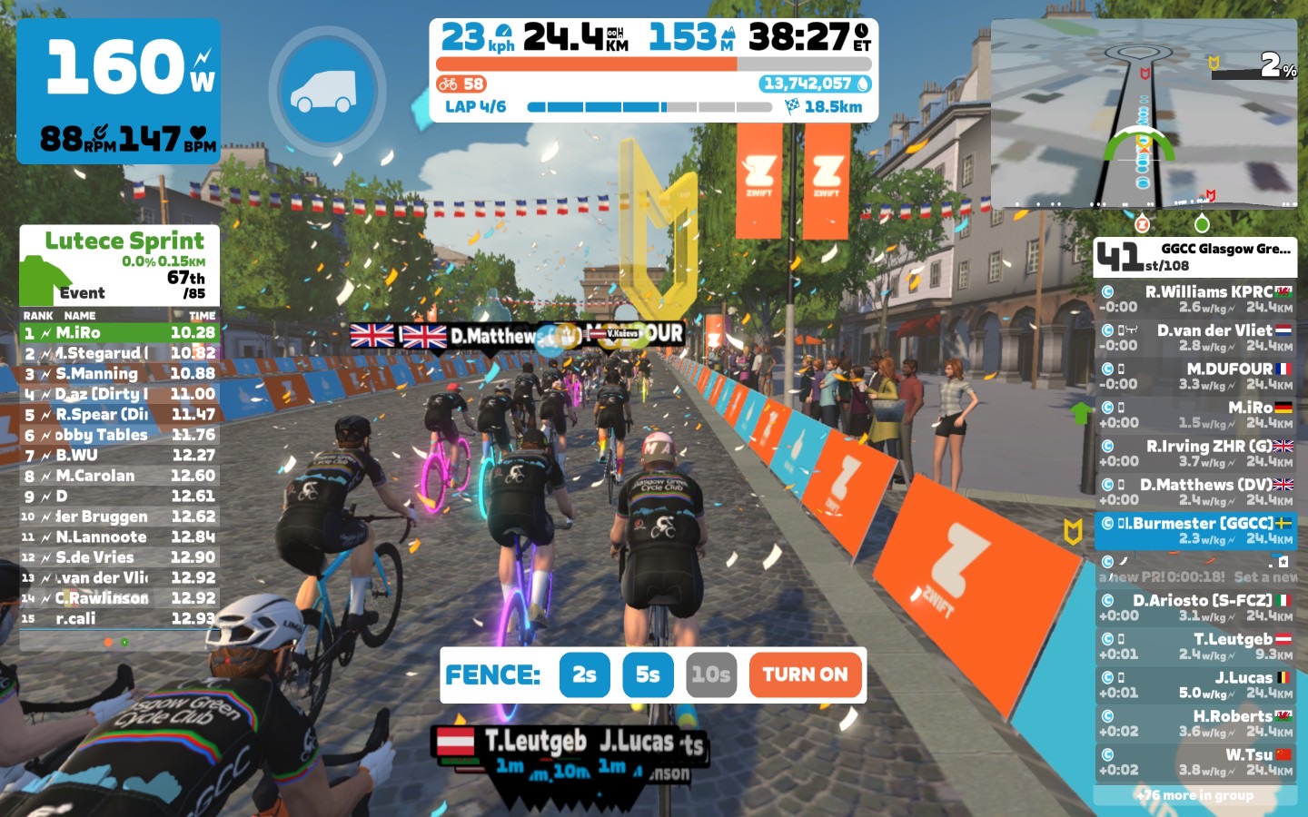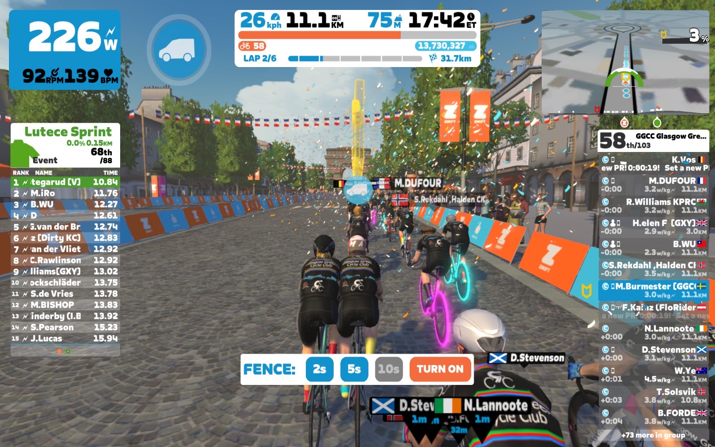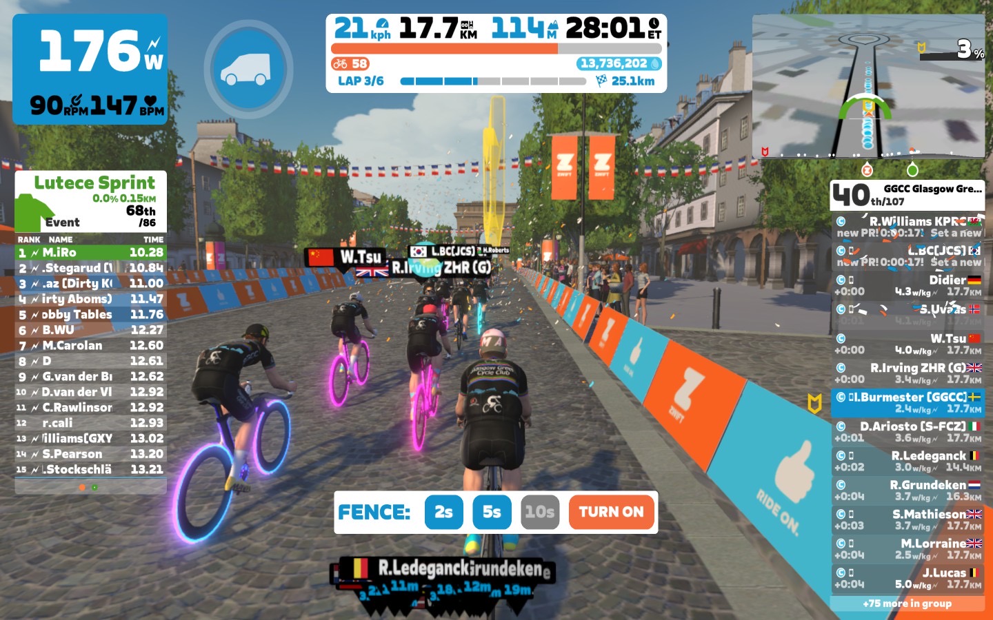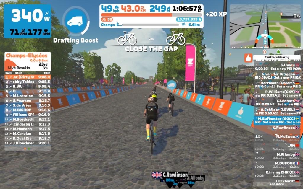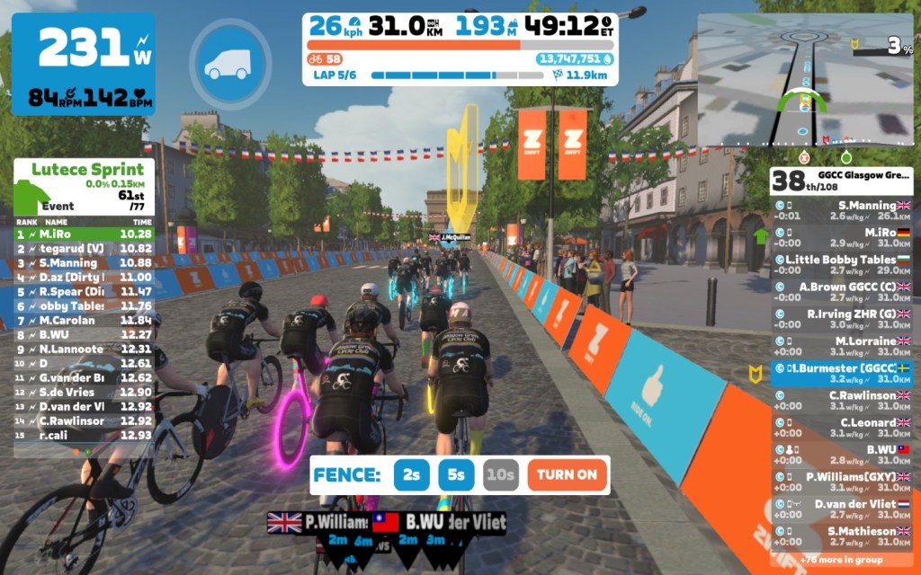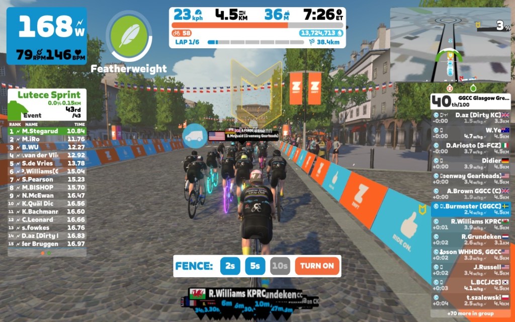 Today I was leading our GGCC team through the virtual streets of the Champs-Élysées on the Zwift riding platform. In total it was a six lap training ride with an optional full lap mini-race at the end.