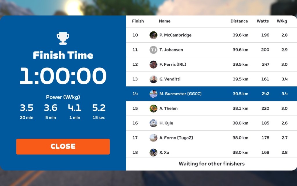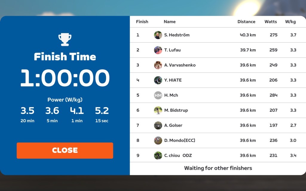We did not have a mini-race as we do on our Saturday rides, but some riders were going quite fast. Let’s check out the finish line after 60minutes: