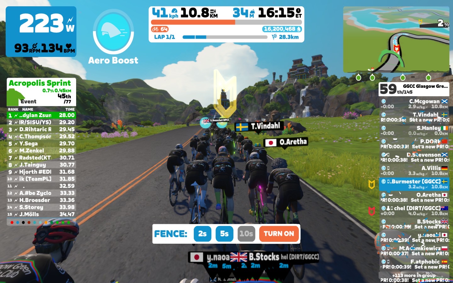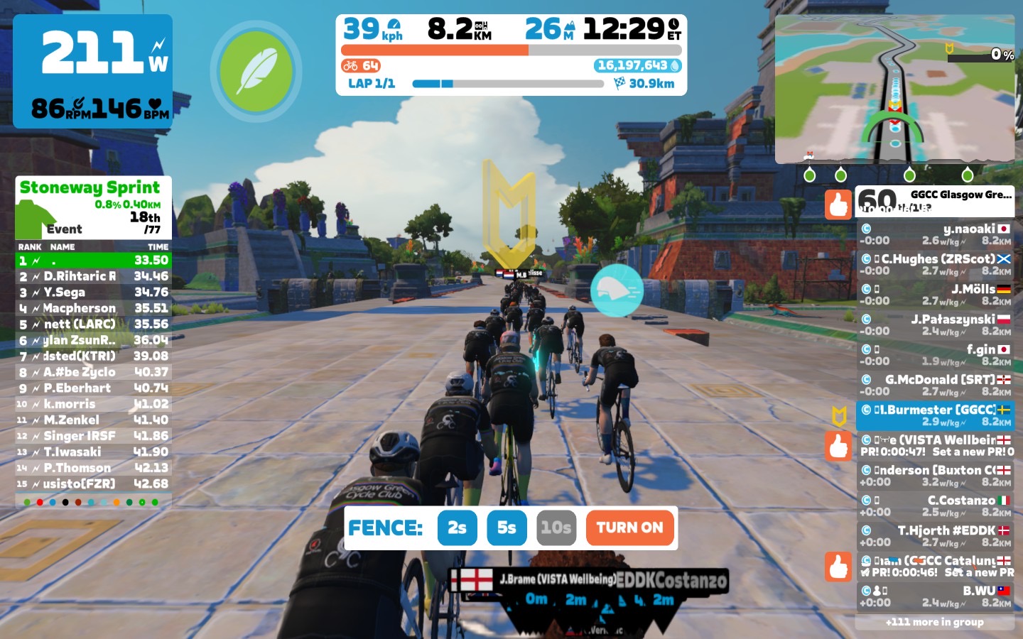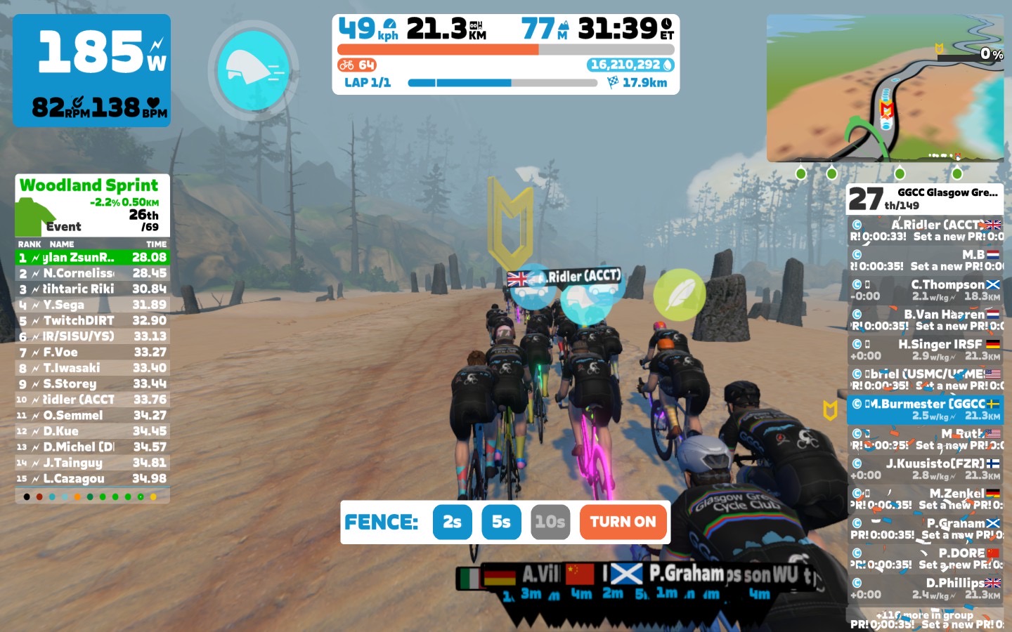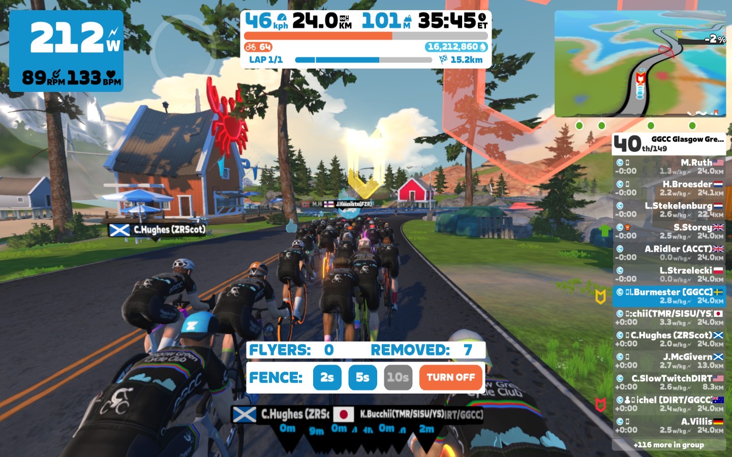 At the green jungle screen I gave the GO to start mini-race, roughly 6,5km long. Directly from the start quite a group went hard right from the gun. Some guys tried sprinting away from the group, but no chance for them. Every rider trying we chased down not only because of our group size but also because Sarah S and Bruch W. did quite a job with me at the front.