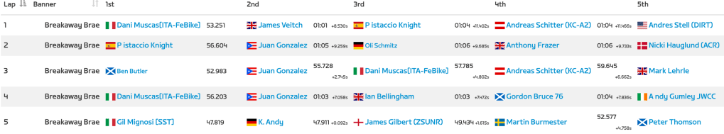 On this course there is no sprint banner as we usually have, but there is a nice and short KOM “Breakaway Brae”. Here not many riders went fast during our first laps, but because of our mini-race there were some nice numbers in the mix (5’th row is from the mini-race).