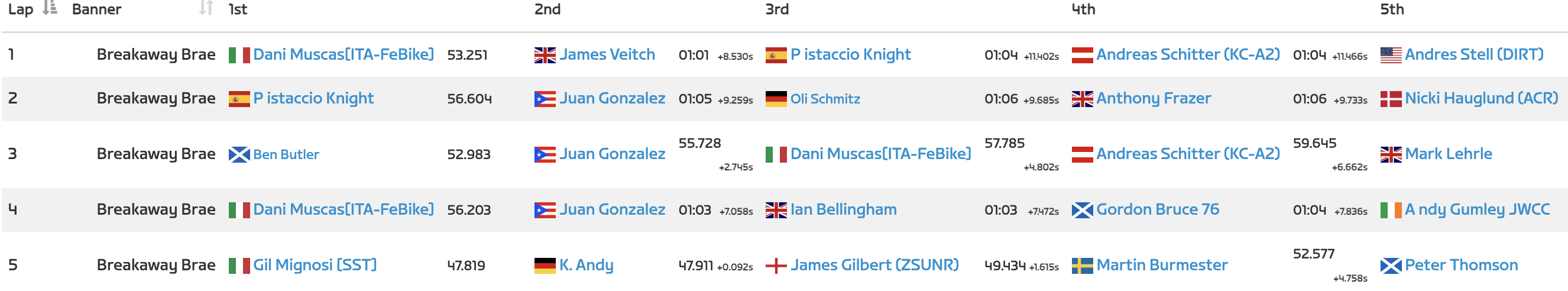 On this course there is no sprint banner as we usually have, but there is a nice and short KOM “Breakaway Brae”. Here not many riders went fast during our first laps, but because of our mini-race there were some nice numbers in the mix (5’th row is from the mini-race).