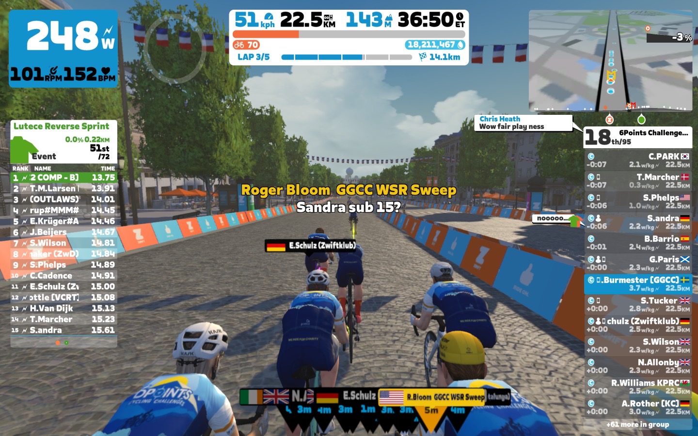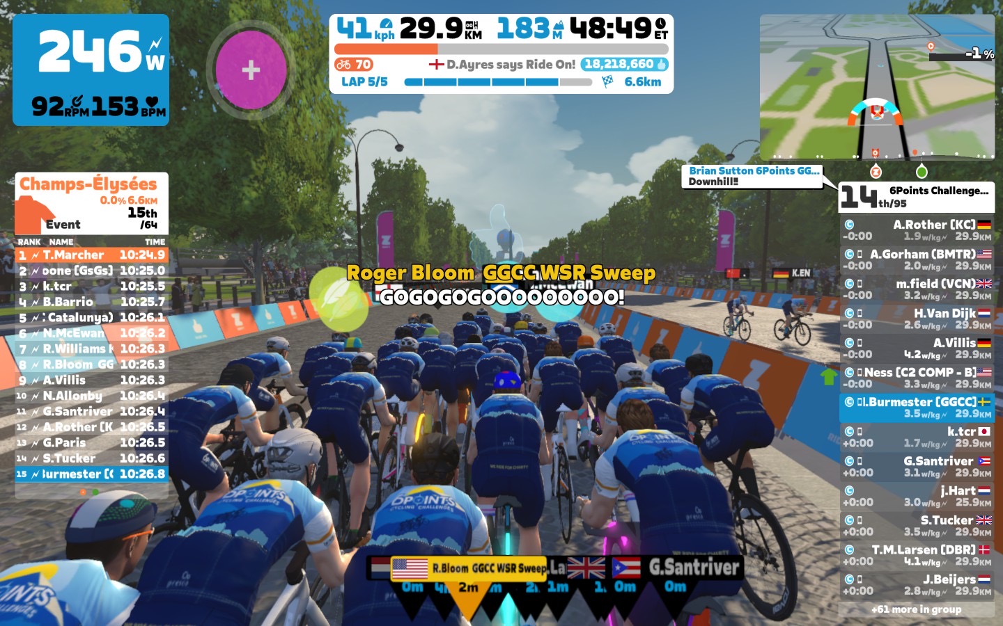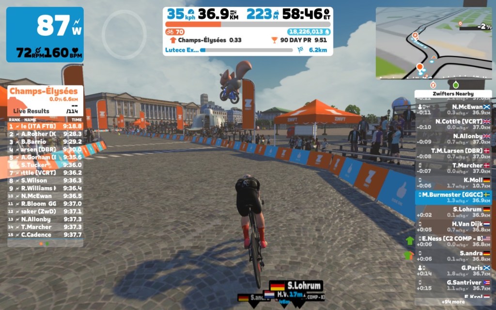 Today Roger B. was leading our 6Points Mallorca team through the virtual streets of Paris on the Zwift riding platform, the “Lutece Express” course. As always we had some sprints and an optional mini-race at the end of the ride, the full last lap.