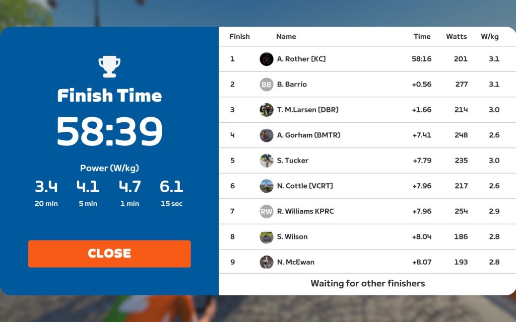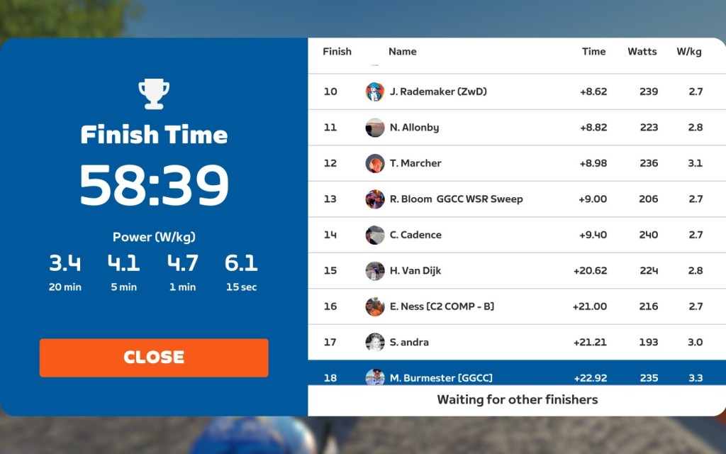 For training purpose I was going on a TT bike, trying to stay with the group as long as possible. For the “normal” four laps it was ok staying at 3,35 W/kg @71kg, around 0,7 W/kg more than the peloton. For the last lap, which was the optional mini-race, I had to push much more. In the end I could not stay with the leading group, but I’m still fine with my performance overall.