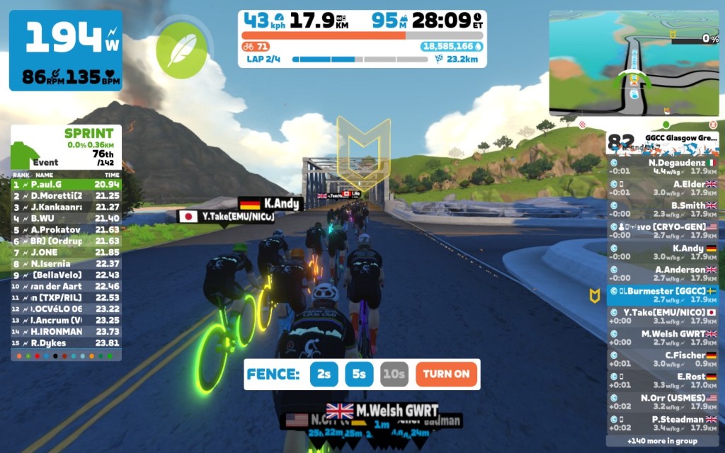 Today I was leading our GGCC team through the virtual streets of Watopia on the “Flat Route” course on the Zwift riding platform. In total it was a four lap training ride with an optional mini-race at the end of the ride. During the ride we had a good chat on our Discord server.
