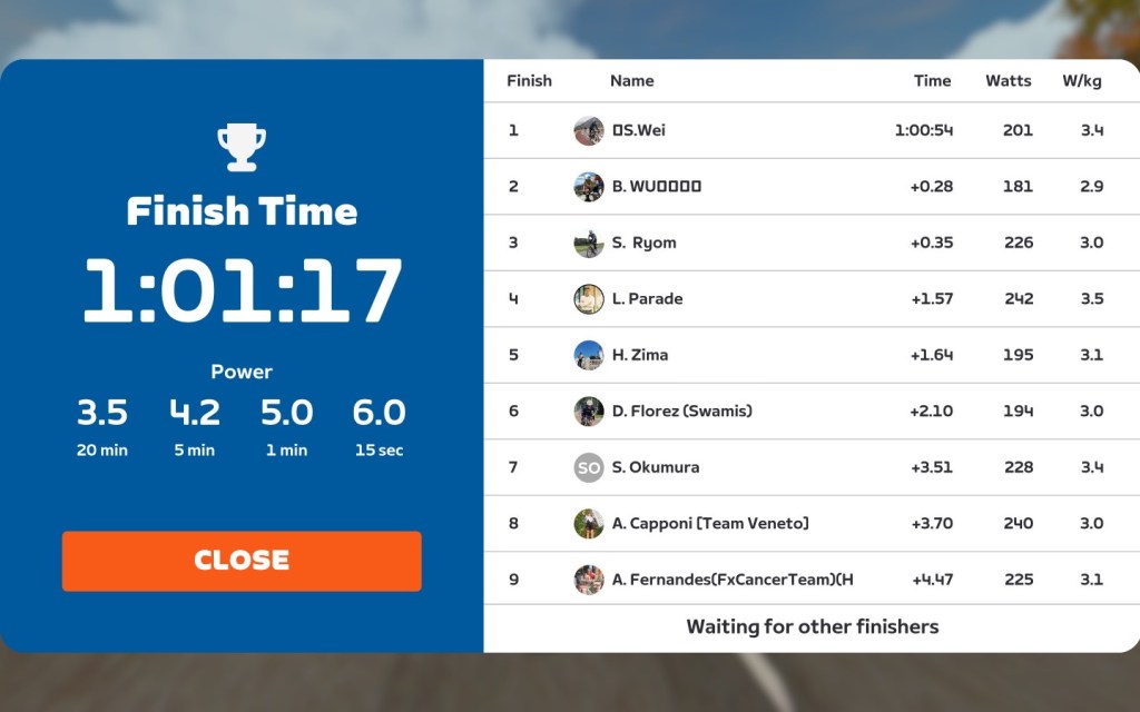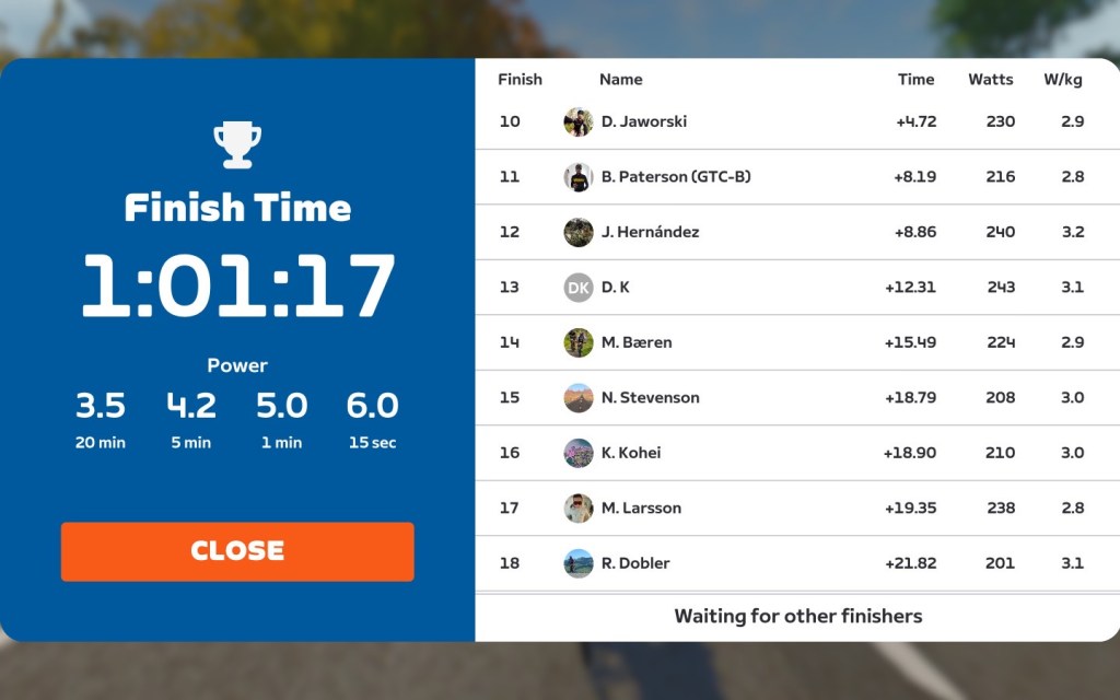 The fourth lap was more for relaxation getting the legs into race mode. Also on the climb we went at around 3,0-3,2 W/kg. Slowing down a bit towards the lap banner we grouped up for having a fair start for our racers.