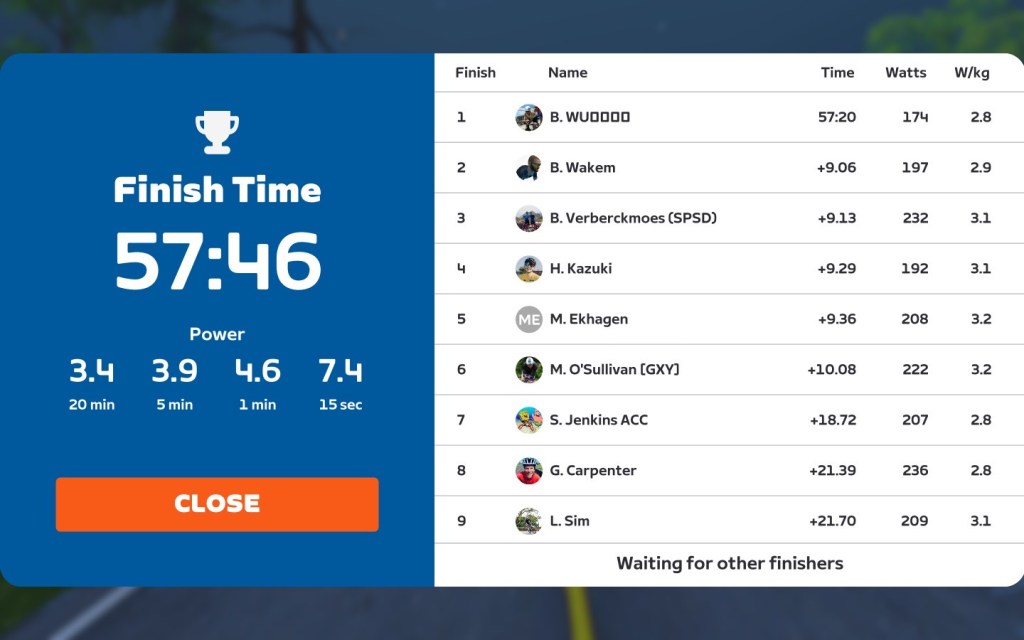 Our leading racers had quite some job to do keeping the momentum down the hill for sprinting to the finish line. But our good friend B. Wu had the best breakaway from the climb. Let’s check out the result: