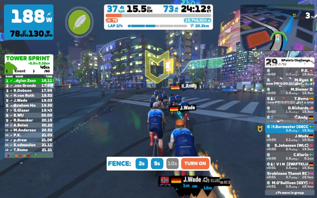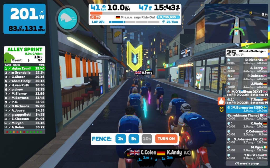 Today I was leading our 6Points Mallorca team through the virtual streets of Makuri Island on the “Electric Loop” course on the Zwift riding platform. In total it was a four lap training ride with four sprints an optional mini-race at the end of the ride.