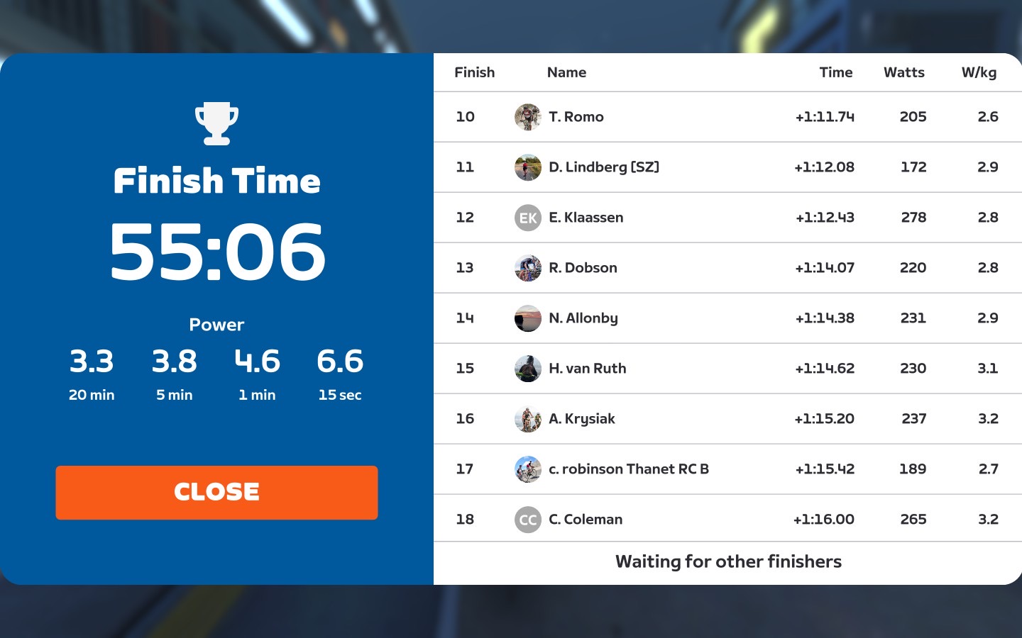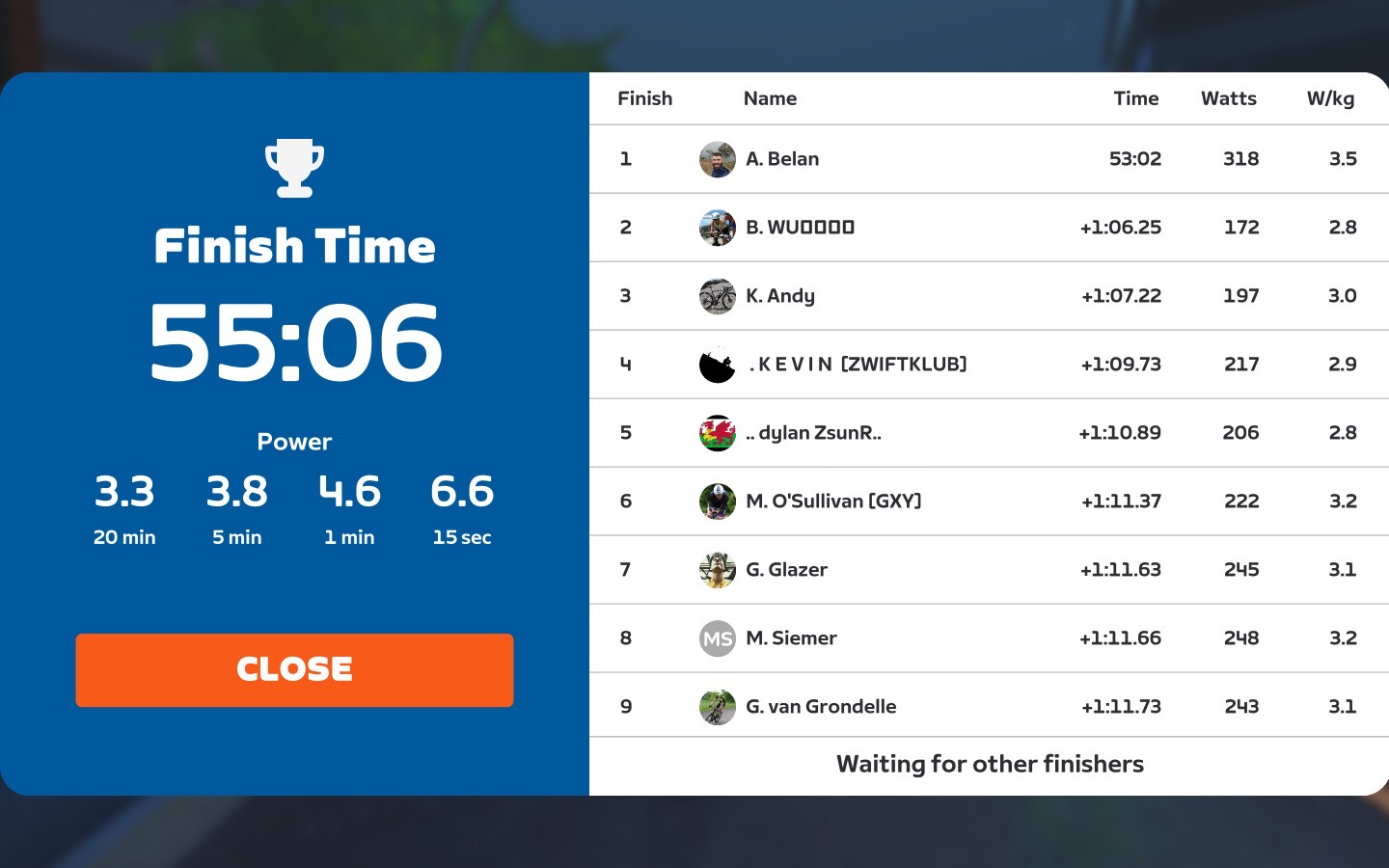 My main focus on pace was around 200W average. The first two laps we went at around 195W, the third lap at 200W. Most of the last lap was our optional minirace where everybody could go at their own speed.