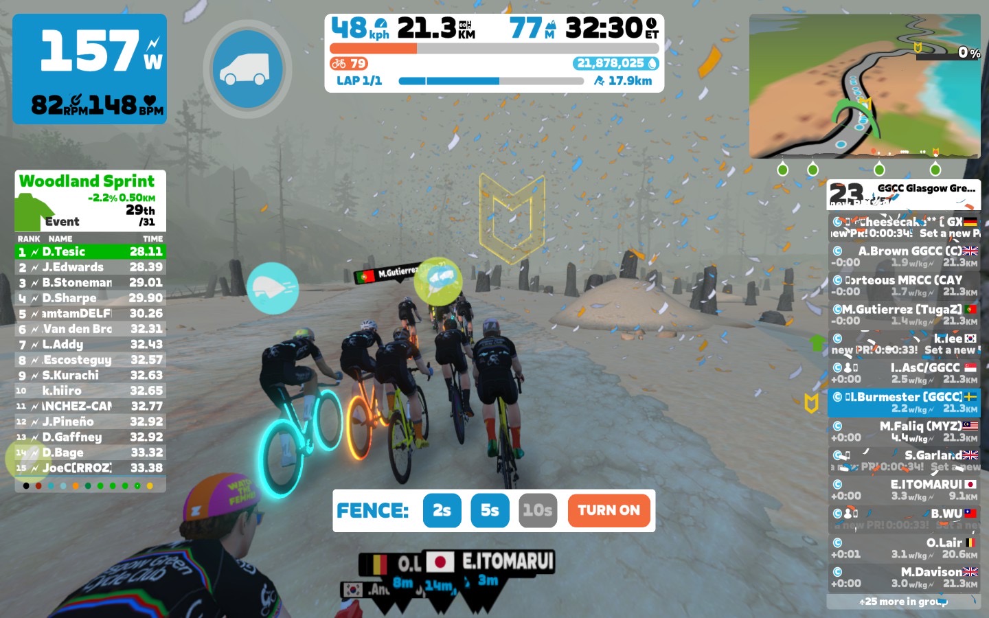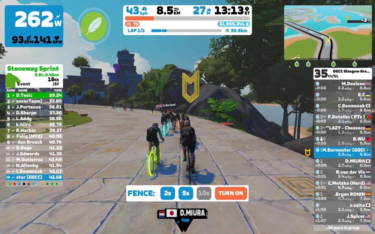 I brought the fence to 2sec and we went nicely along the bypass road. At the arch back to the jungle I gave the GO GO GO for our racers – and off they went.