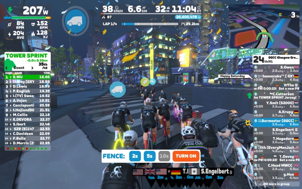 Today I was leading our GGCC team through the virtual streets of Makuri Island on the “Electric Loop” course on the Zwift riding platform. In total it was a four lap training ride with four sprints an optional mini-race at the end of the ride.