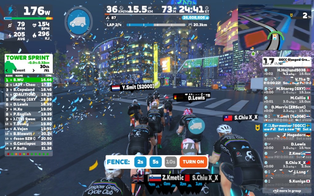 I brought the fence slowly down first to 5sec and than to 2sec. Close to the lap end I went down with the power as well, around 2,6 W/kg.