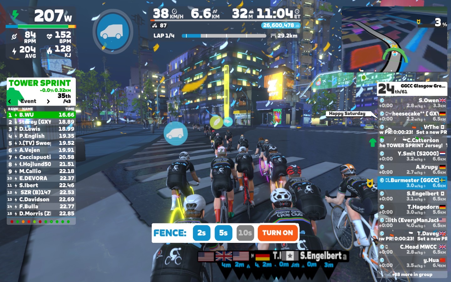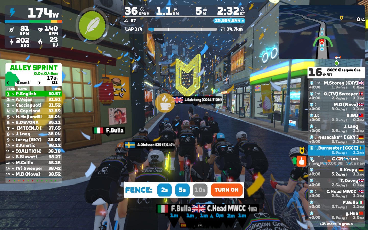 I brought the fence slowly down first to 5sec and than to 2sec. Close to the lap end I went down with the power as well, around 2,6 W/kg.