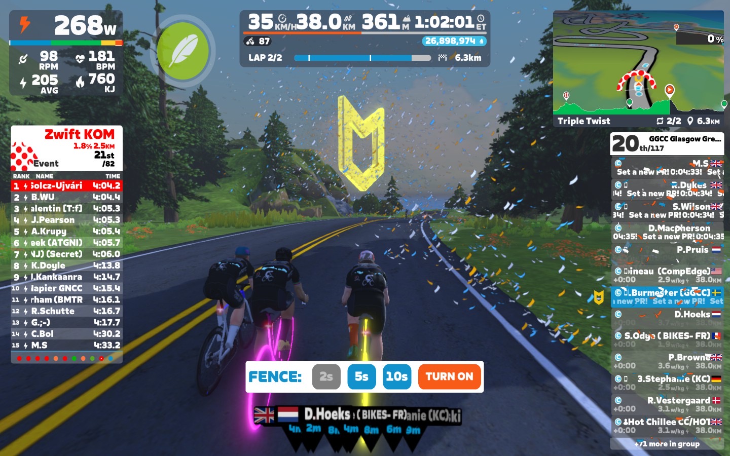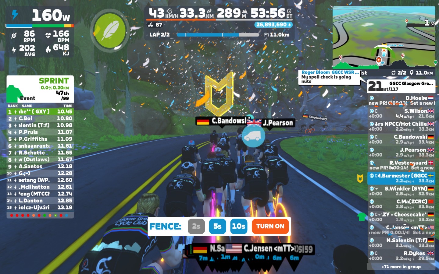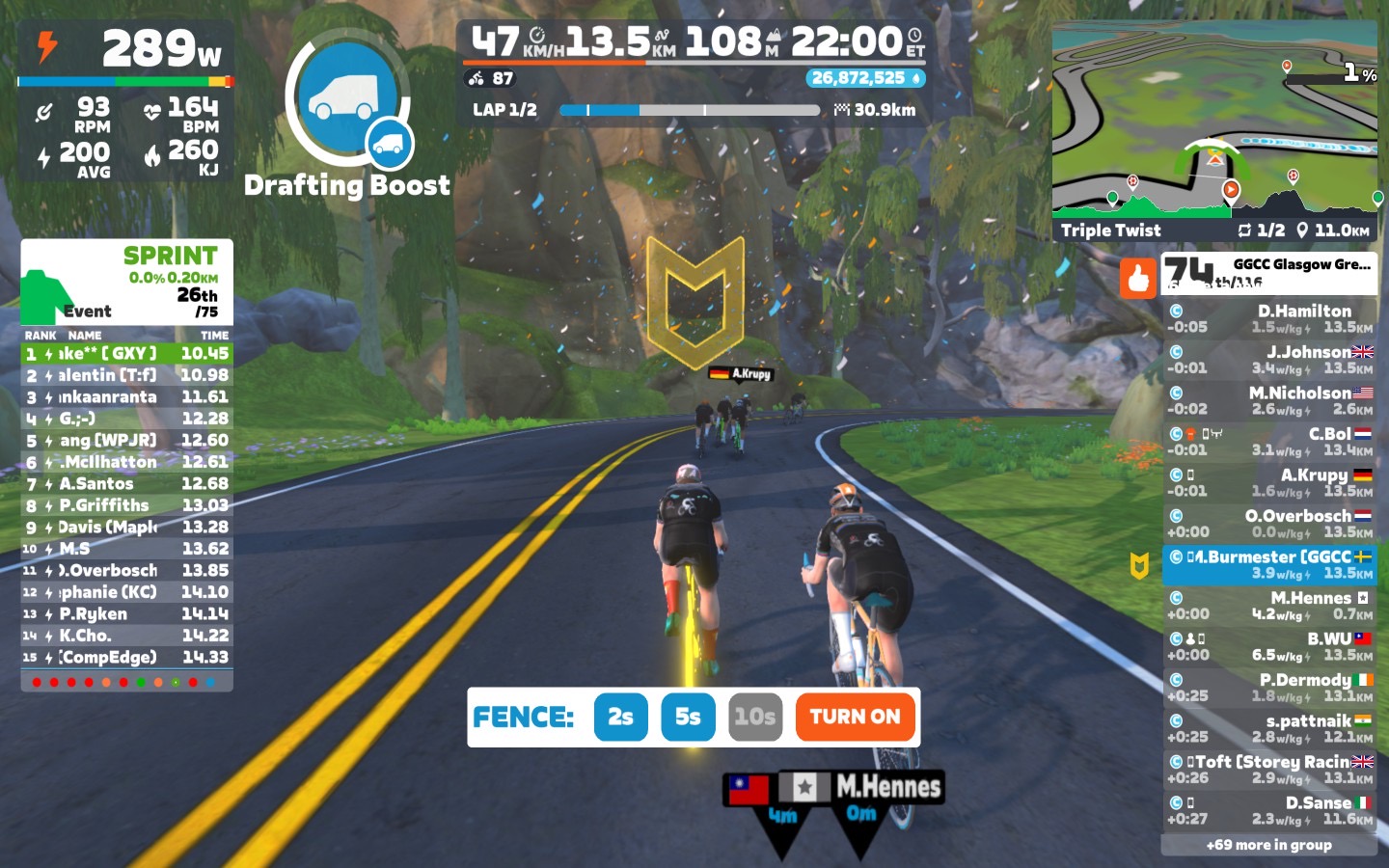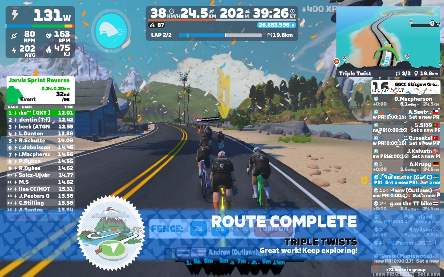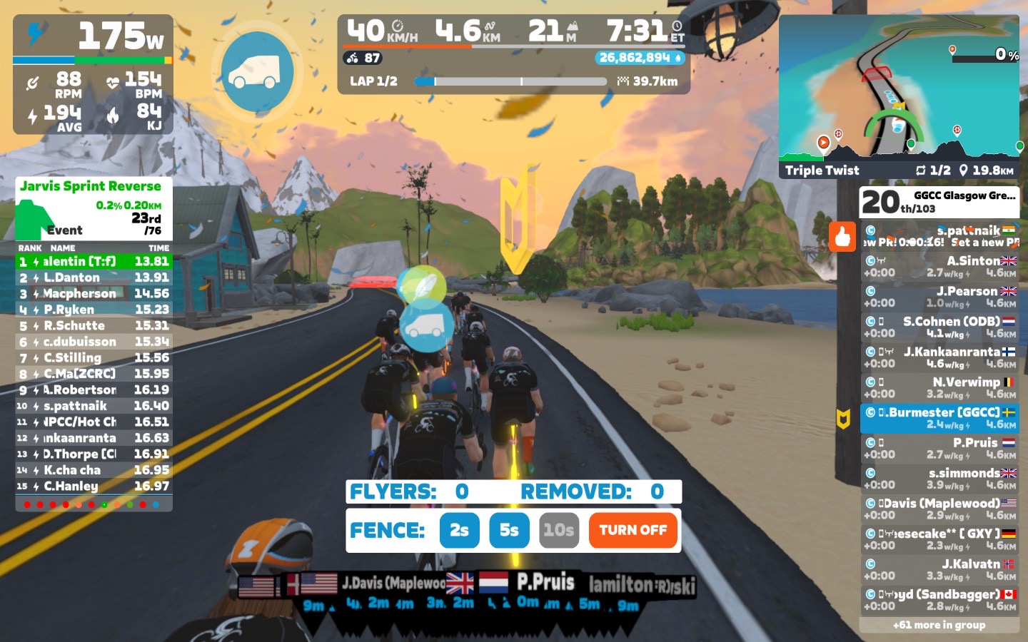 Today I was leading our GGCC team through the virtual streets of Watopia on the “Triple Twist” course on the Zwift riding platform. In total it was a two lap training ride with two sprints each lap and an optional mini-race at the end of the ride.