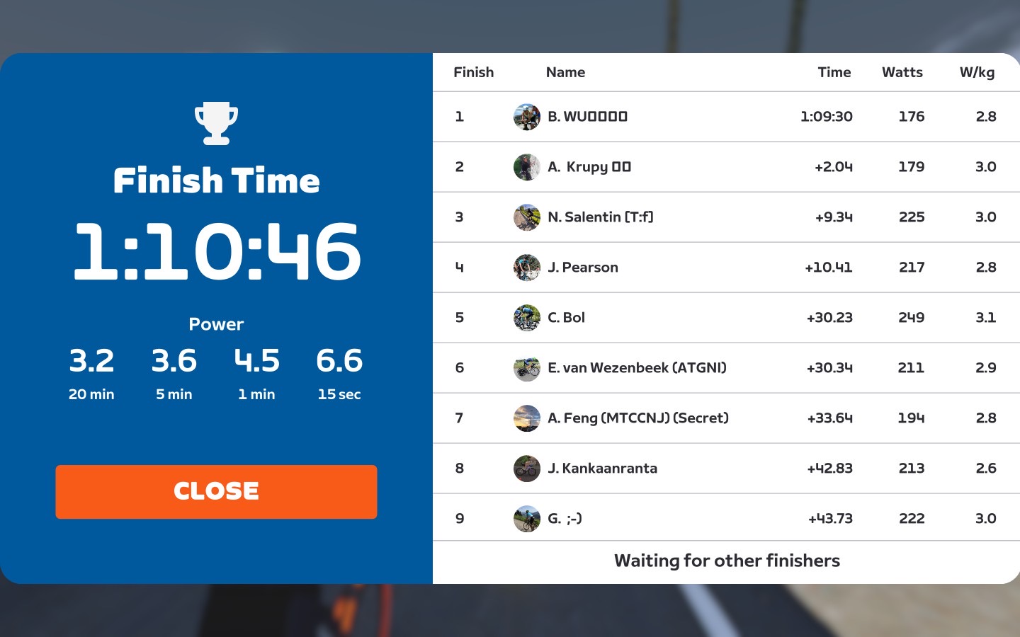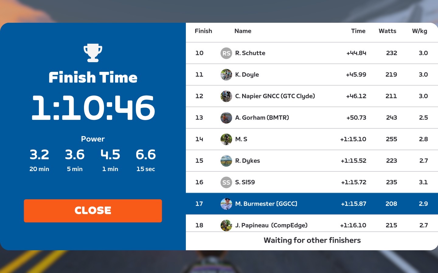 My main focus on pace was around 195-200W average over the whole course. The challenge was keeping the group together because of the two climbs each lap.