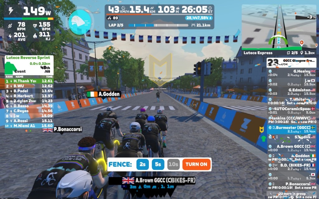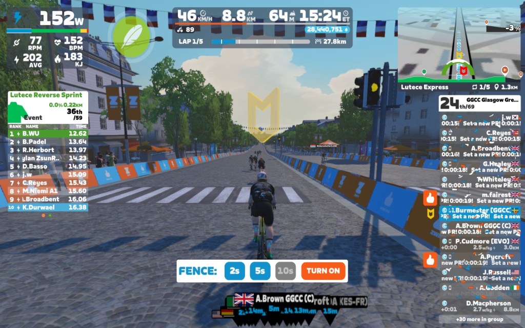 Today I was leading our GGCC team through the virtual streets of the “Lutece Express” in Paris on the Zwift riding platform. In total it was a five lap training ride with an optional full lap mini-race at the end.