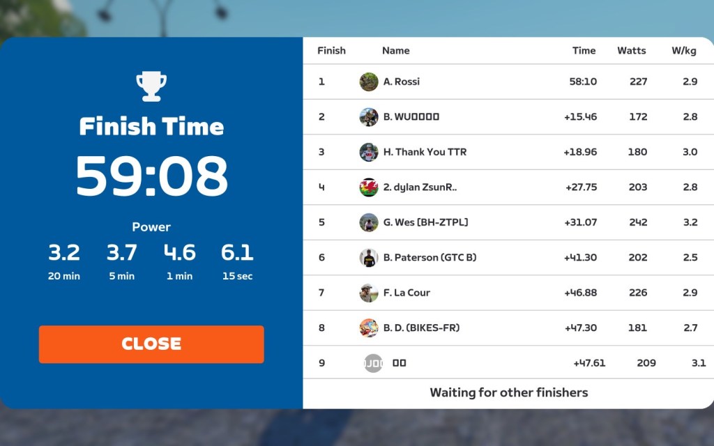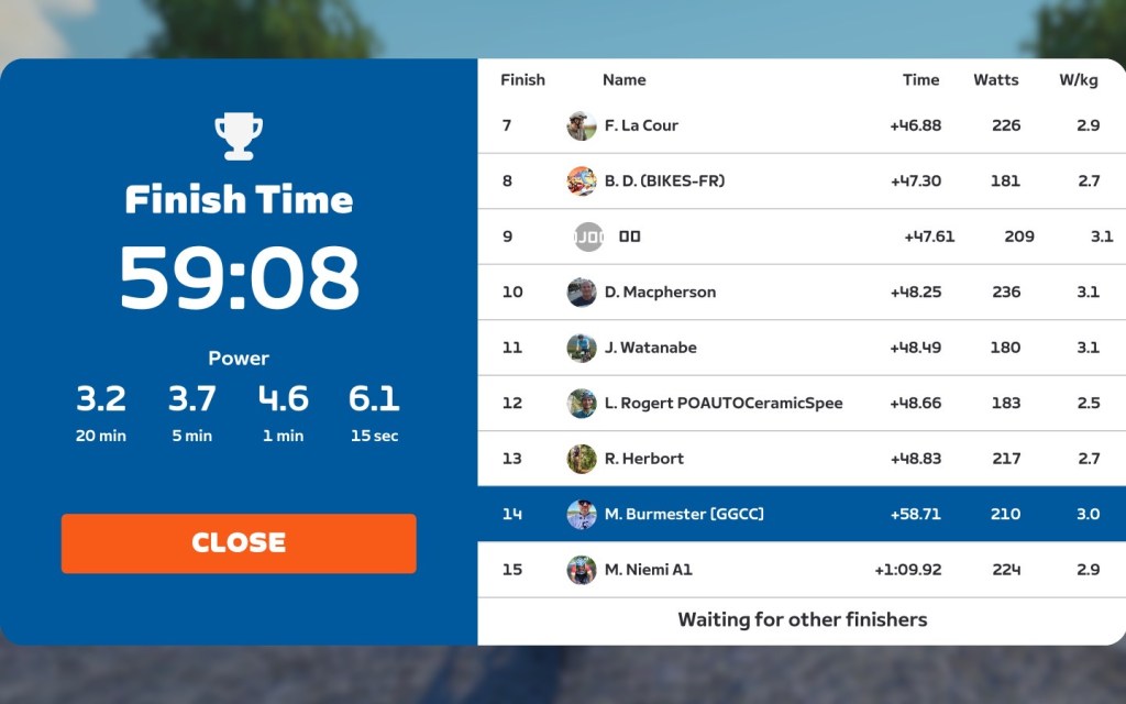 Now the sprints were done and dusted. We took a more relaxing lap before we came to our optional minirace. I went at a little lower pace, but still good enough for having a good race start. In total we came up to a 200W average for the first four laps. This of course changed dramatically for the last lap 👹
