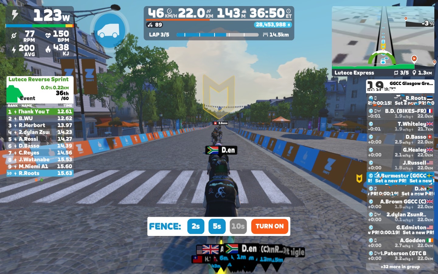 Today I was leading our GGCC team through the virtual streets of the “Lutece Express” in Paris on the Zwift riding platform. In total it was a five lap training ride with an optional full lap mini-race at the end.