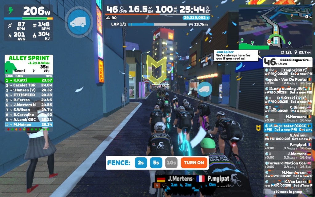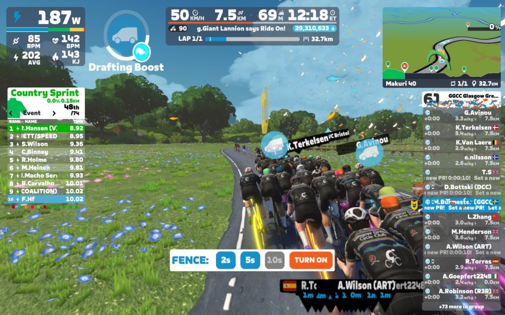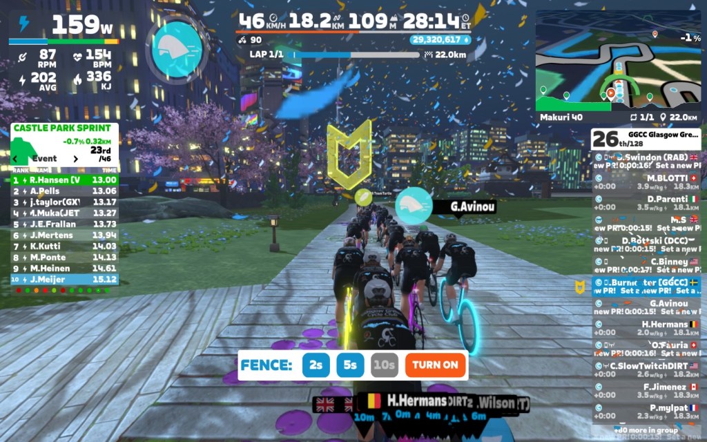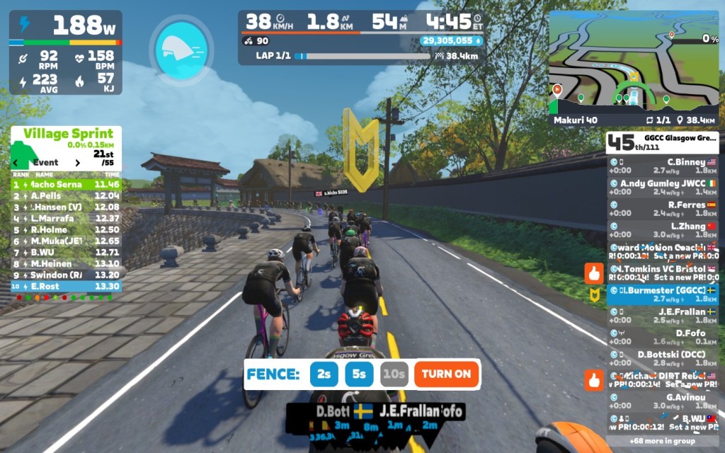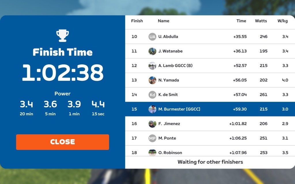 Today I was leading our GGCC team through the virtual streets of Makuri Islands on the “Makuri 40” course on the Zwift riding platform. We did a one lap training ride with four sprints and an optional mini-race at the end of the ride.