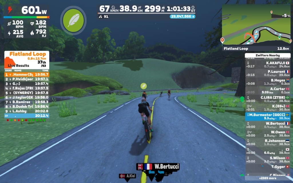 Today I was leading our GGCC team through the virtual streets of the Flatland Loop on the Zwift riding platform. In total it was a three lap training ride with some good sprints and an optional mini-race.