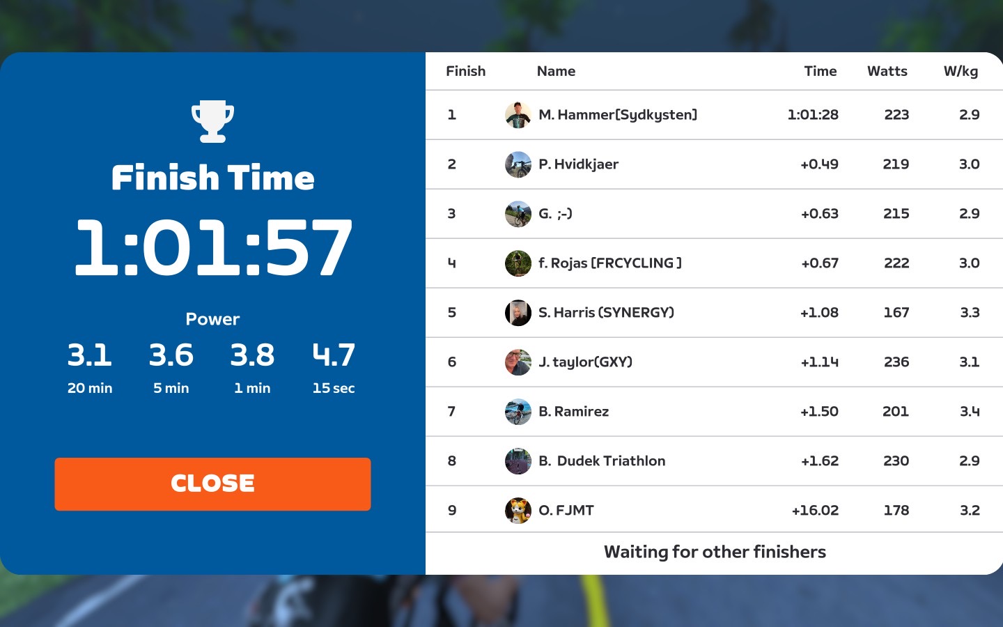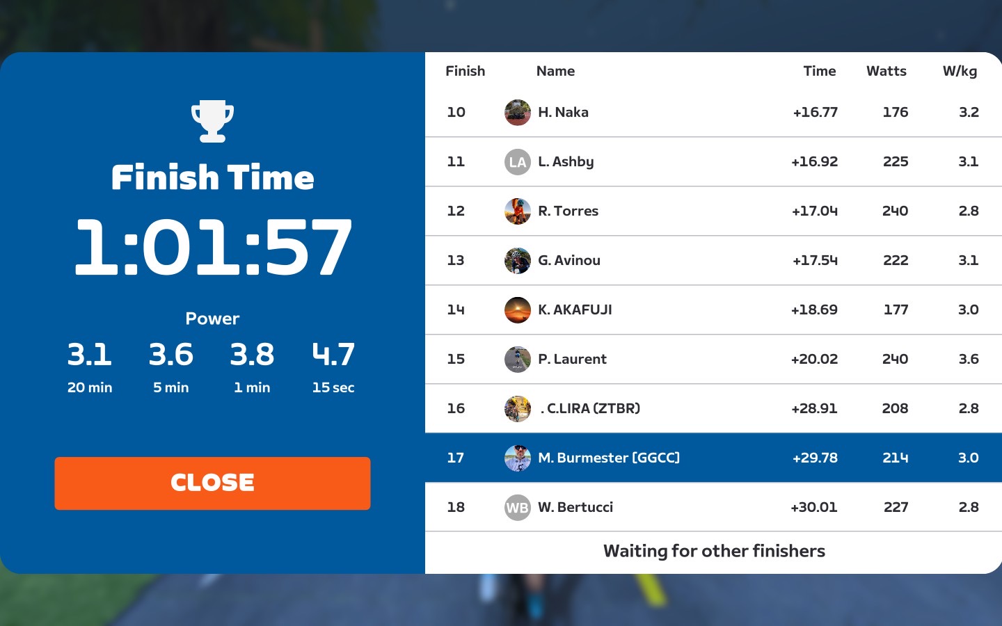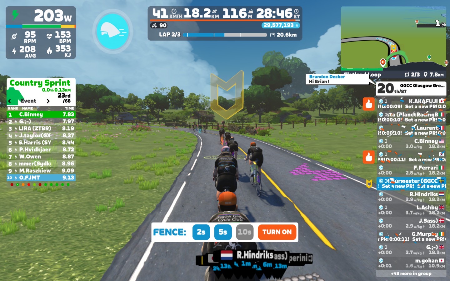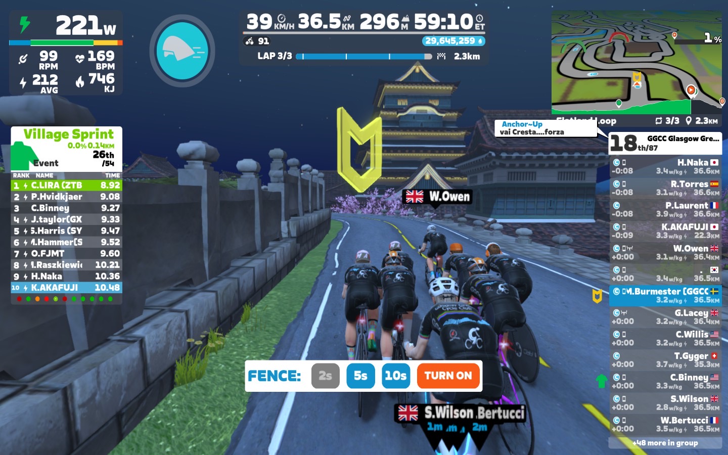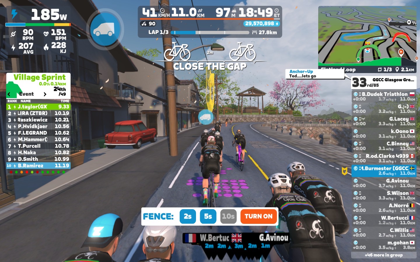 Basically we went down in power a bit for preparation of our racers legs. Slowly I brought the fence down to 5sec first and 2sec before the race start. We had the group good together for having a fair race start.