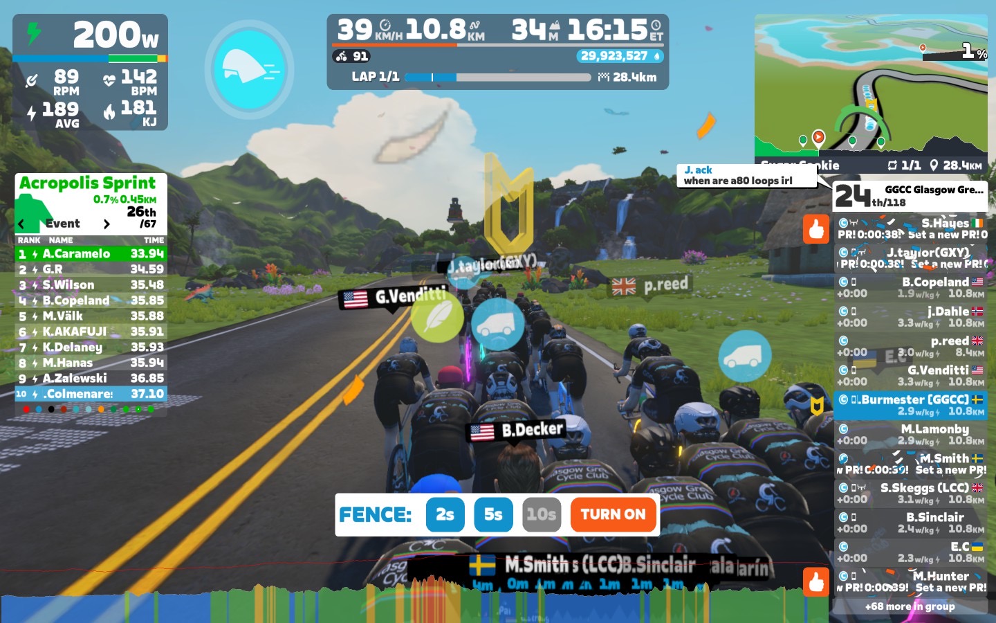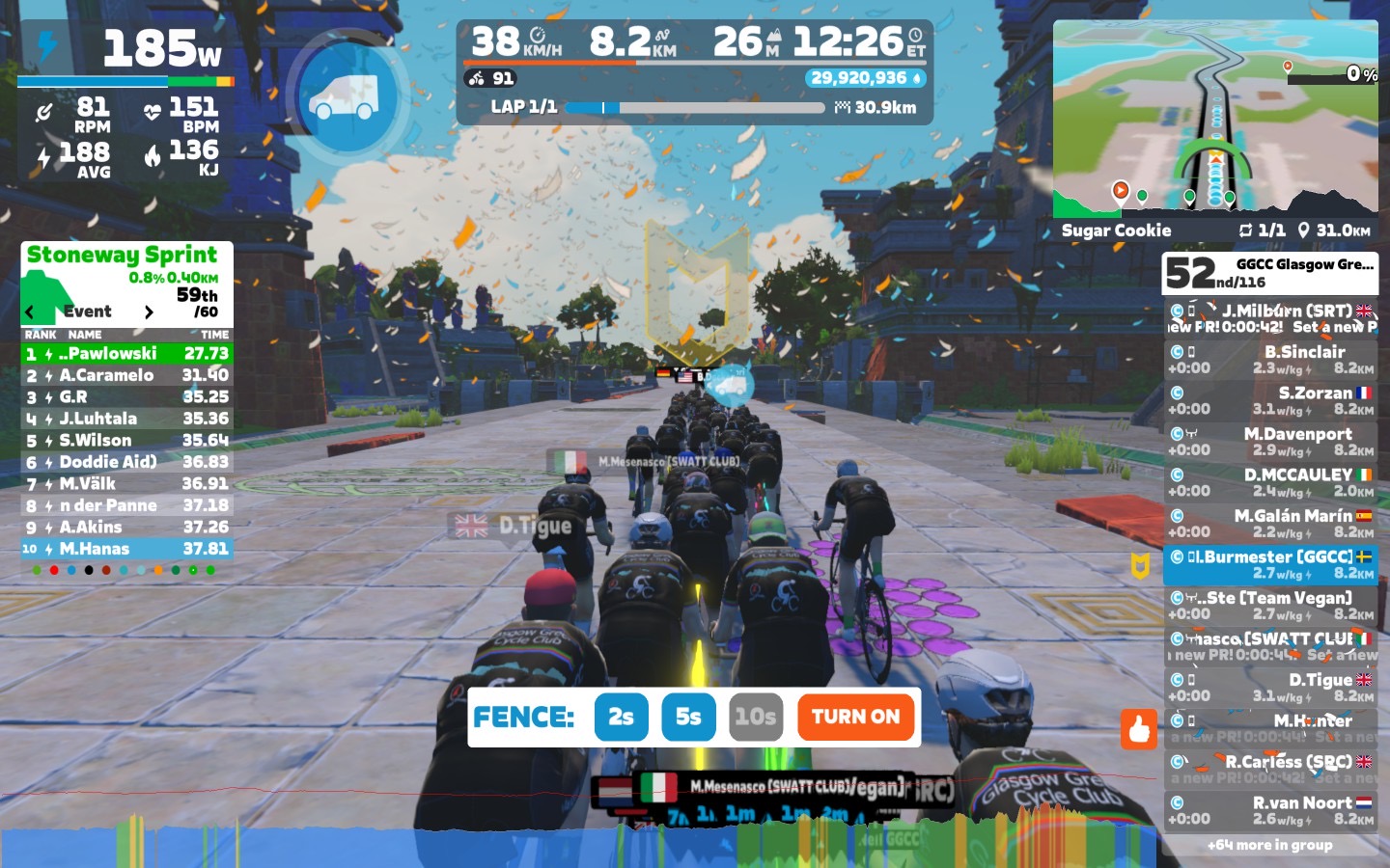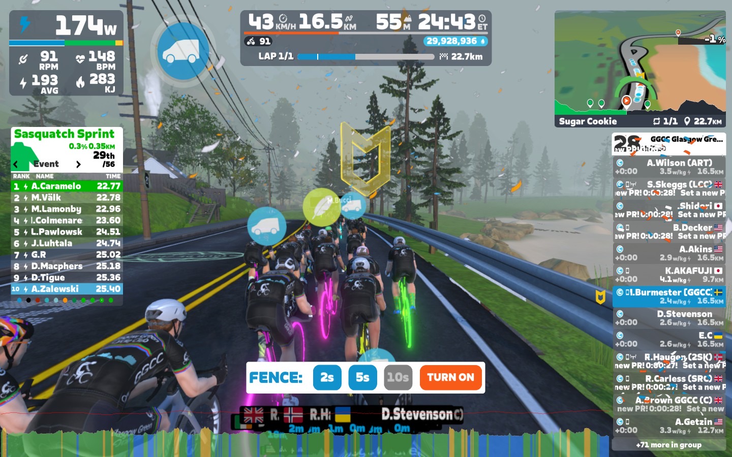 Today I was leading our GGCC team through the virtual streets of Watopia on the Zwift riding platform. Today we did the “Sugar Cookie”, my all time favorite. Thanks Jam for going in red today. Good job!