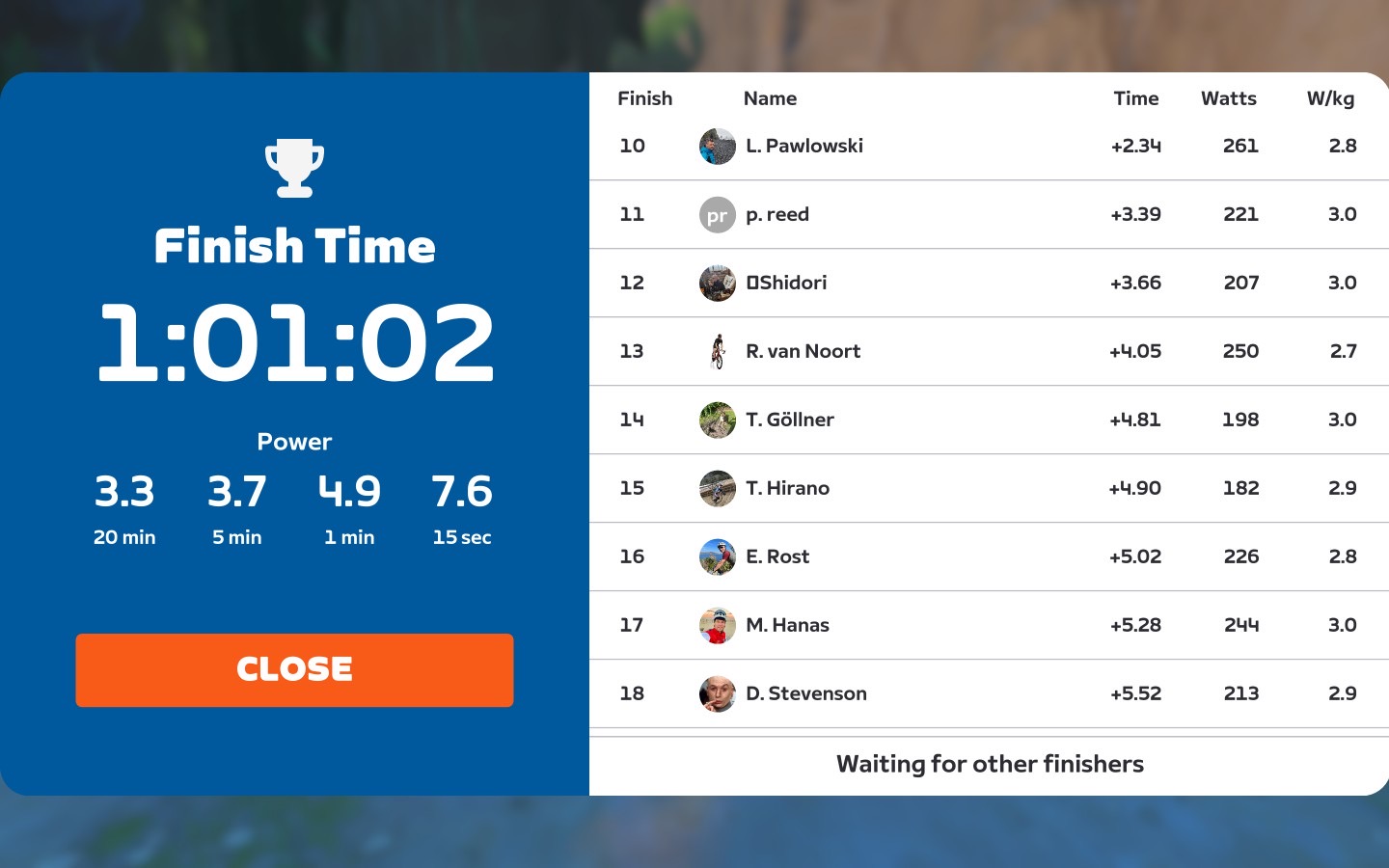 For the lead-in through the jungle, we went at around 2,6W/kg. After the start on the flats, we maintained 2,8W/kg. Higher power was needed on the uphills. The biggest challenge was the last long climb. I tried to keep the group together by staying at a power around 3,4-3,6 W/kg. Luckily, the bypass back to the jungle was long enough. It brought the group back together. This allowed for a fair race start.