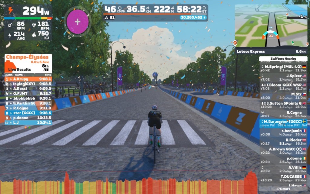 Today, I guided our GGCC team through the virtual streets of the “Lutece Express.” We rode in Paris on the Zwift riding platform. In total it was a five lap training ride with an optional full lap mini-race at the end.