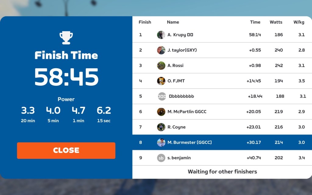Now the sprints were done and dusted. We took a more relaxing lap before we came to our optional minirace. I went at a little lower pace, but still good enough for having a good race start. In total we came up to a 202W average for the first four laps. This of course changed dramatically for the last lap 👹