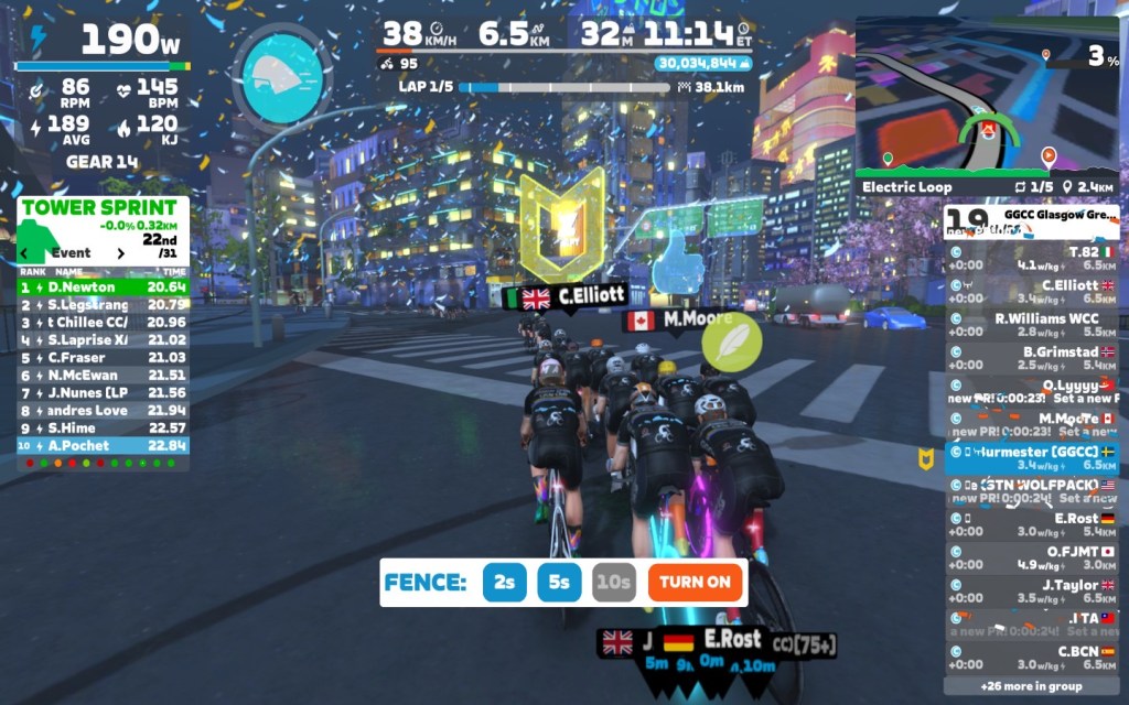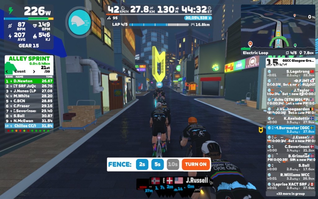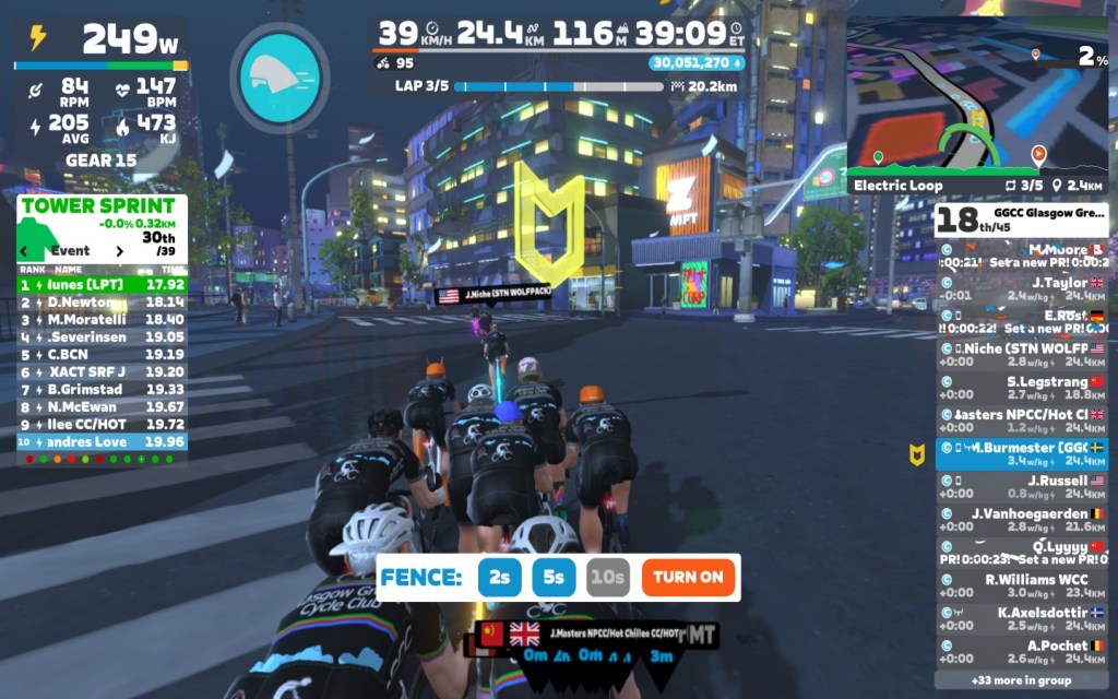 I brought the fence slowly down first to 5sec and than to 2sec. Close to the lap end I went down with the power as well, around 2,6 W/kg.