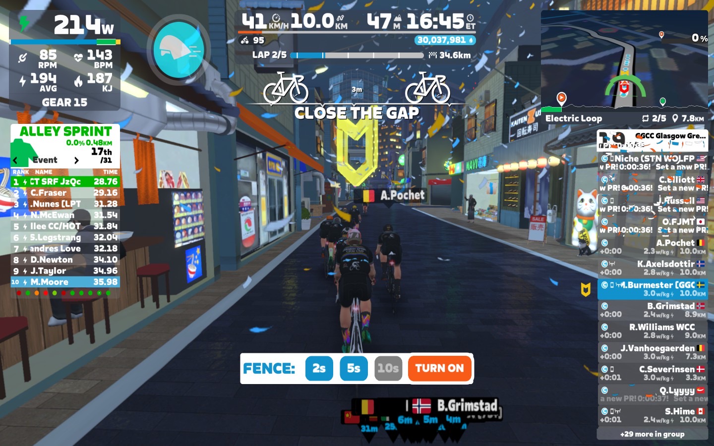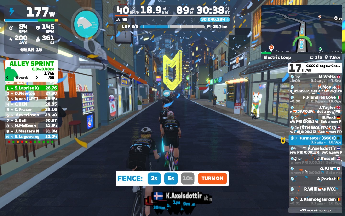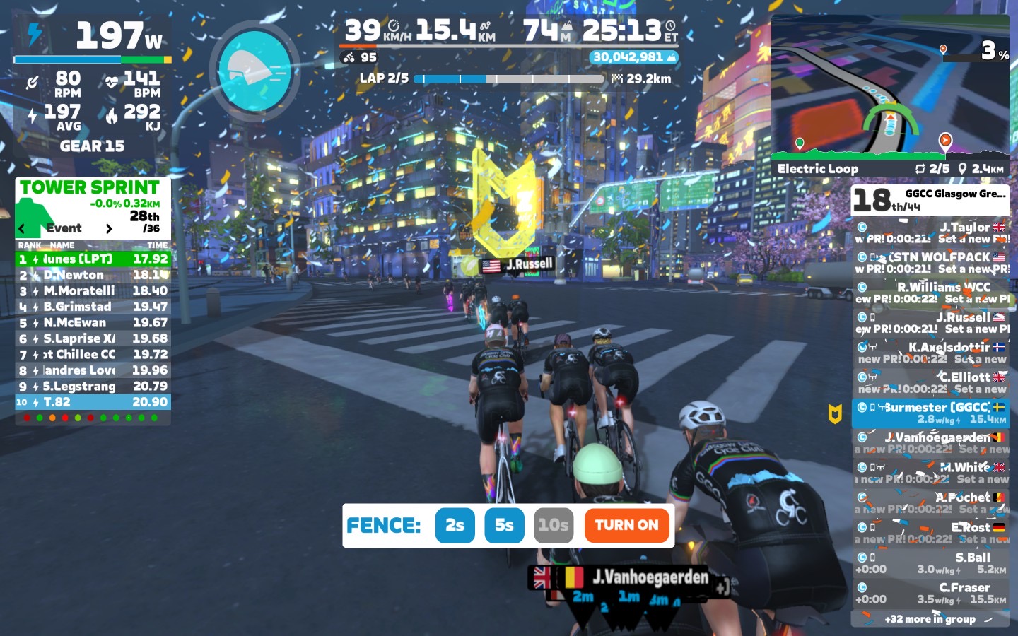 I brought the fence slowly down first to 5sec and than to 2sec. Close to the lap end I went down with the power as well, around 2,6 W/kg.