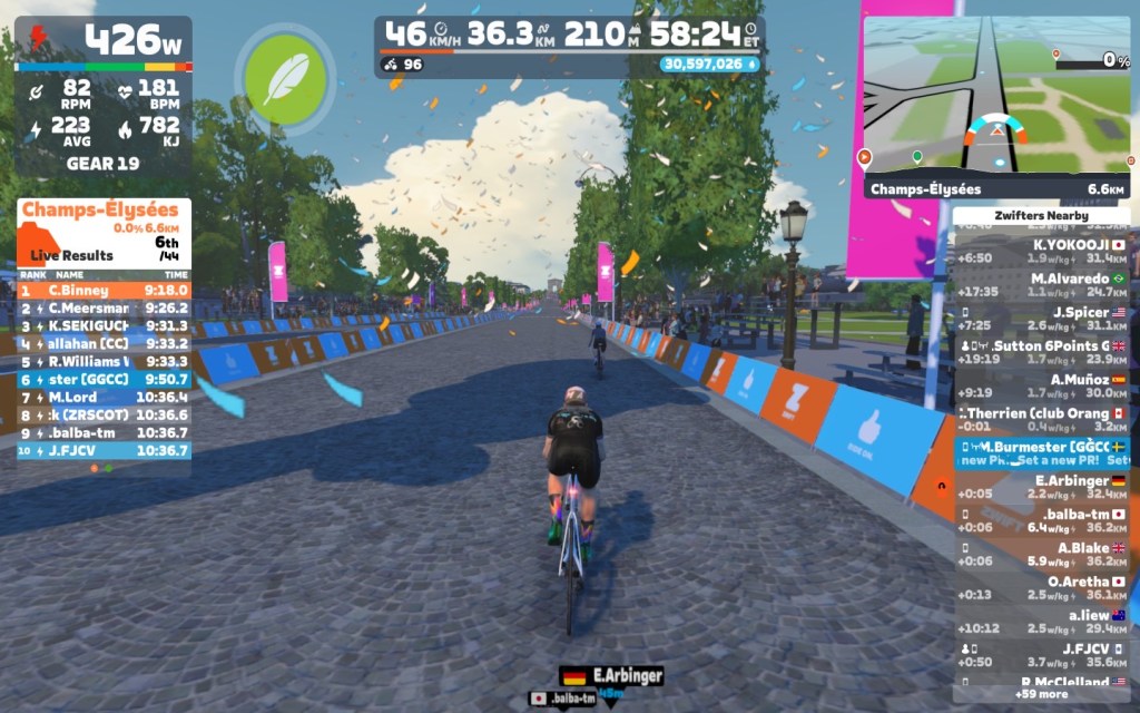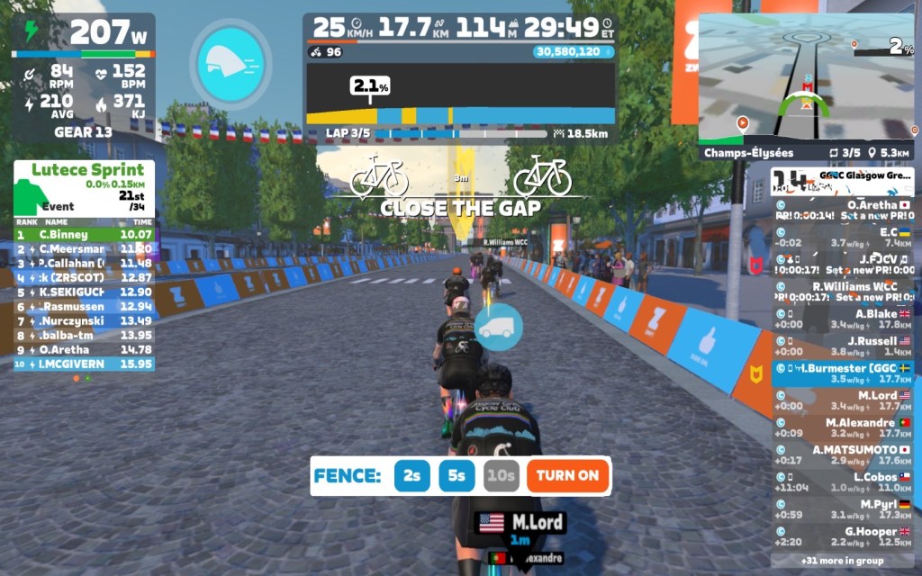 Today I was leading our GGCC team through the virtual streets of the Champs-Élysées on the Zwift riding platform. In total it was a five lap training ride with an optional full lap mini-race at the end.