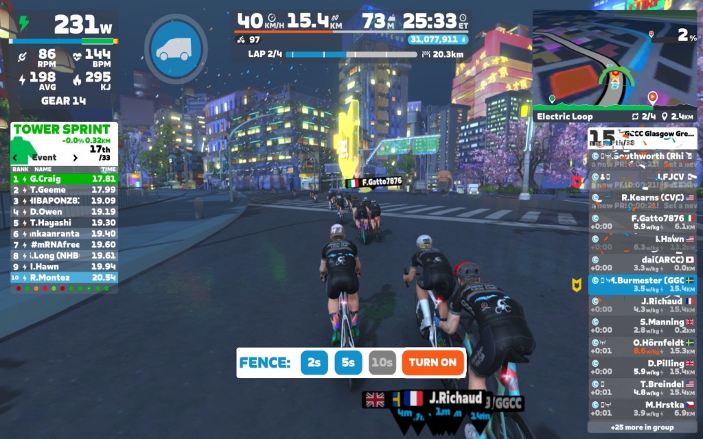 Today, I led our GGCC team through the virtual streets of Makuri Island. This activity was on the “Electric Loop” course on the Zwift riding platform. In total, it was a four-lap training ride. There were four sprints and an optional mini-race at the end of the ride.