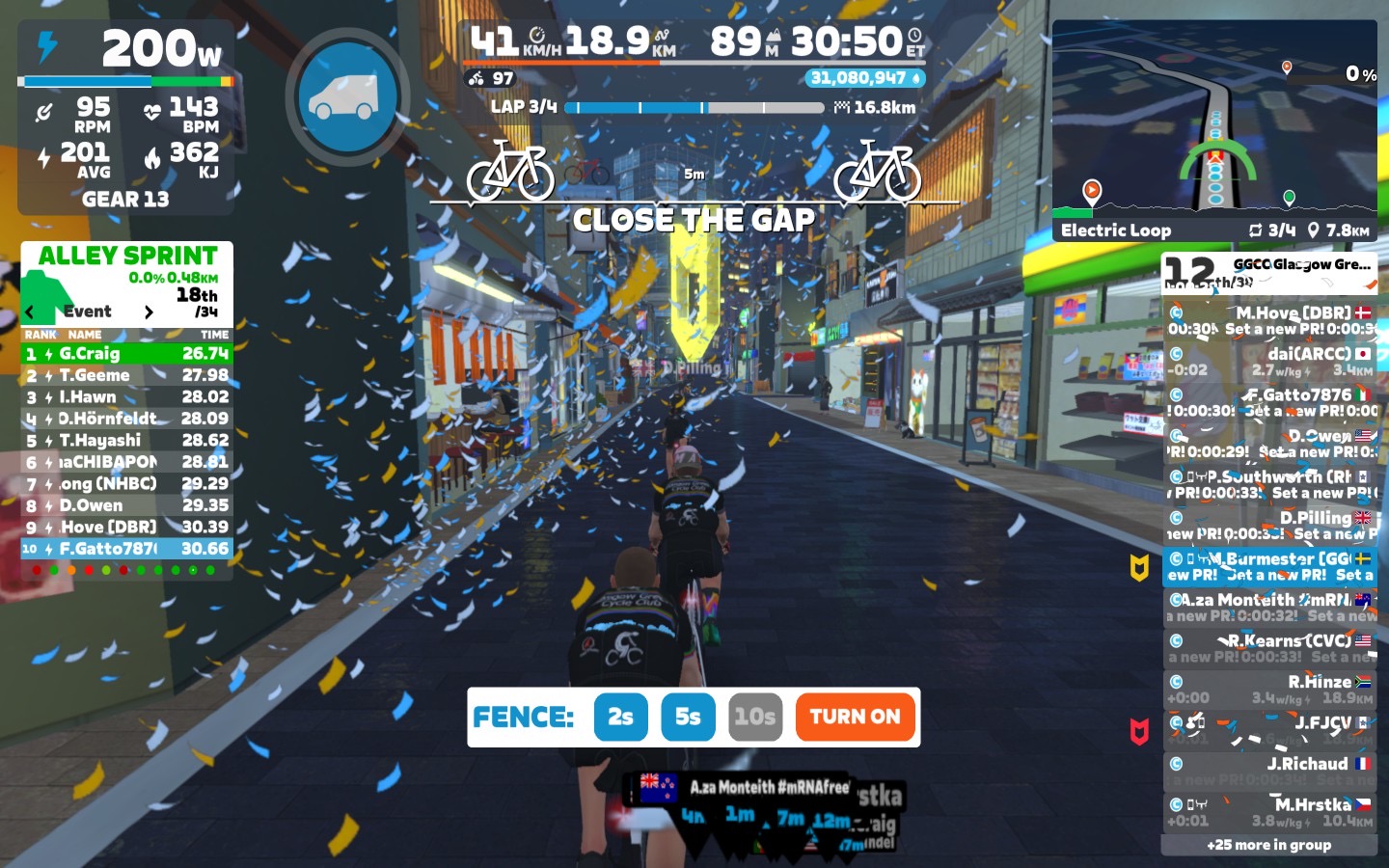 Today, I led our GGCC team through the virtual streets of Makuri Island. This activity was on the “Electric Loop” course on the Zwift riding platform. In total, it was a four-lap training ride. There were four sprints and an optional mini-race at the end of the ride.