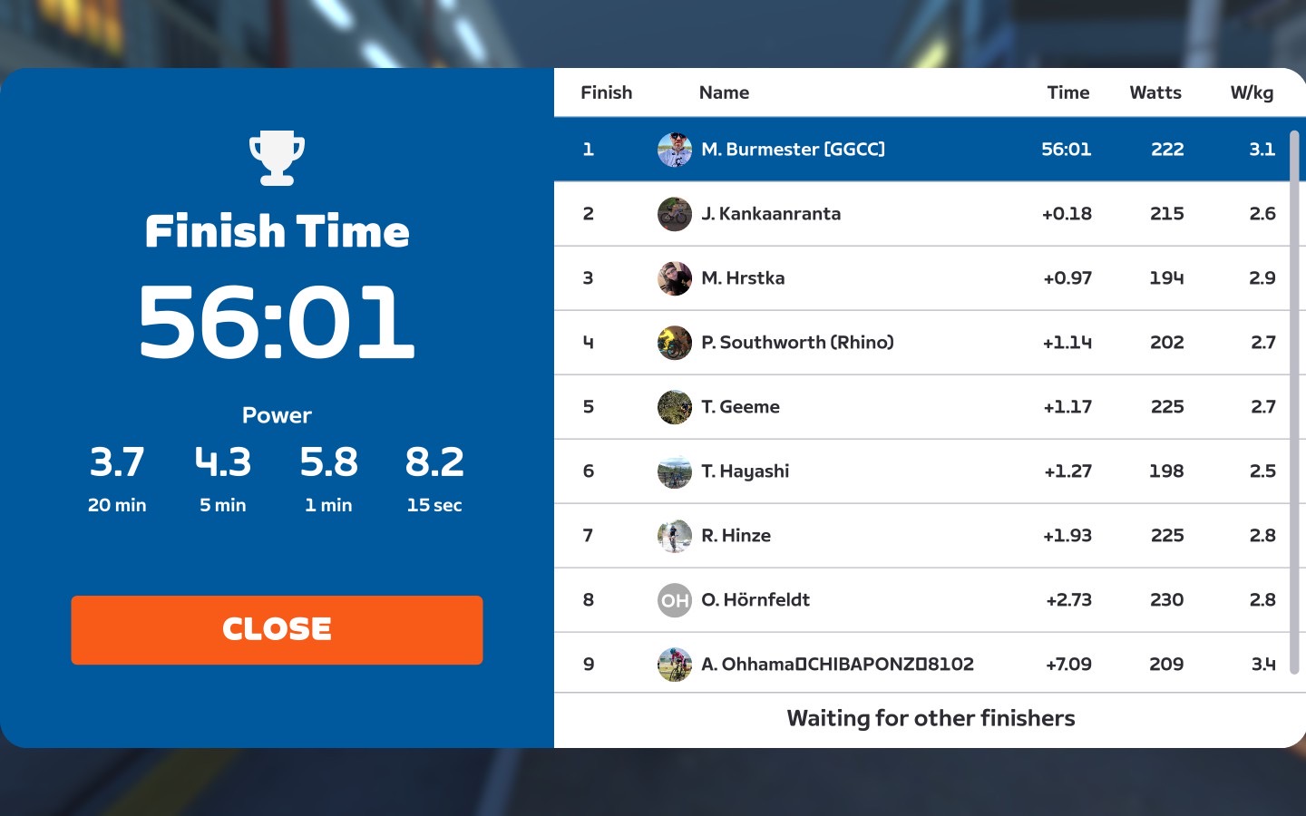 My main focus on pace was starting at 195 and slowly going up to 205W average. The first lap we went at around 196W, right before the minirace start we reached 204W. Important was keeping always a steady 90-95 rpm. Most of the last lap was our optional minirace where everybody do go at their own speed.