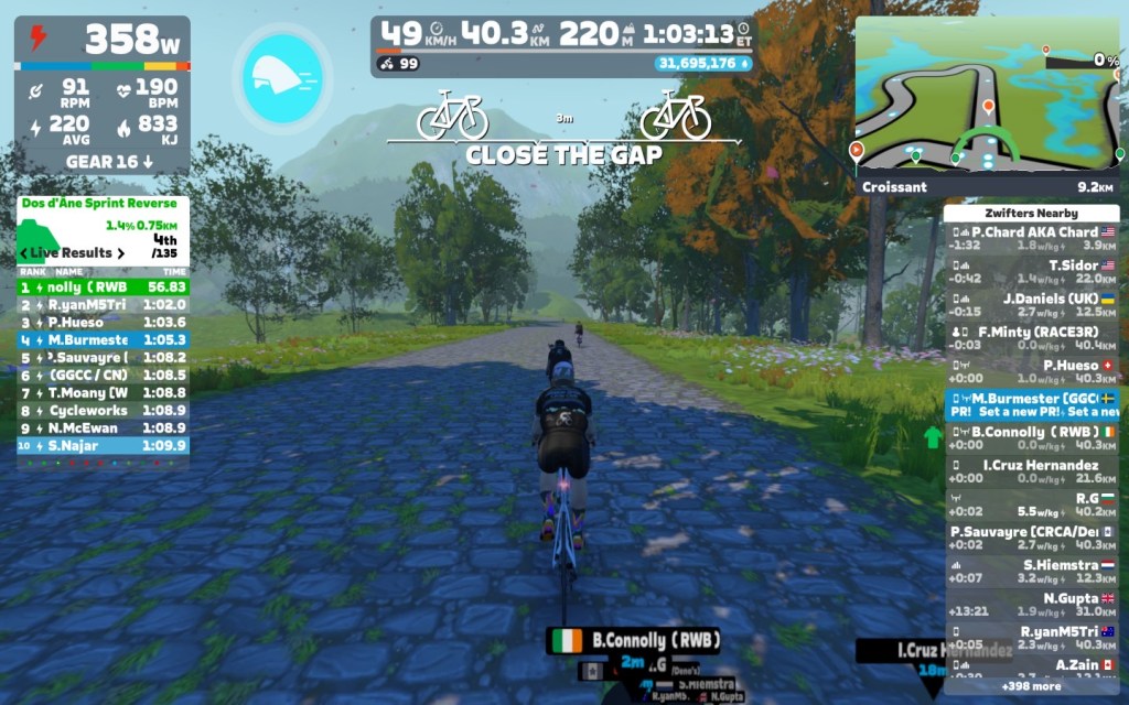 Today I was leading our GGCC team through the virtual streets of the “Croissant” course on the Zwift riding platform. In total it was a four lap training ride with some good sprints and an optional mini-race at the end.
